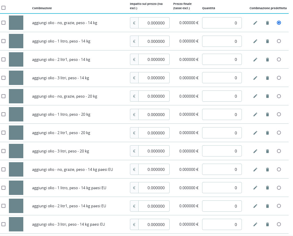Codencode Posted November 15, 2021 Share Posted November 15, 2021 Come ti dicevo, il problema è che non risultano combinati tra di loro i 2 gruppi. Selezionando 4 valori da aggiungi olio e valori da peso dovresti ritrovarti con 12 combinazioni (righe) mentre tu ne hai solo 6. Non è che hai creato prima le combinazioni del gruppo Aggiungi olio e poi quelle del gruppo peso? Le combinazioni le devi generare selezionando gli attributi da entrambi i gruppi poi cliccare su Generate Ti ho allegato lo screenshot di come dovrebbero essere le combinazioni Link to comment Share on other sites More sharing options...