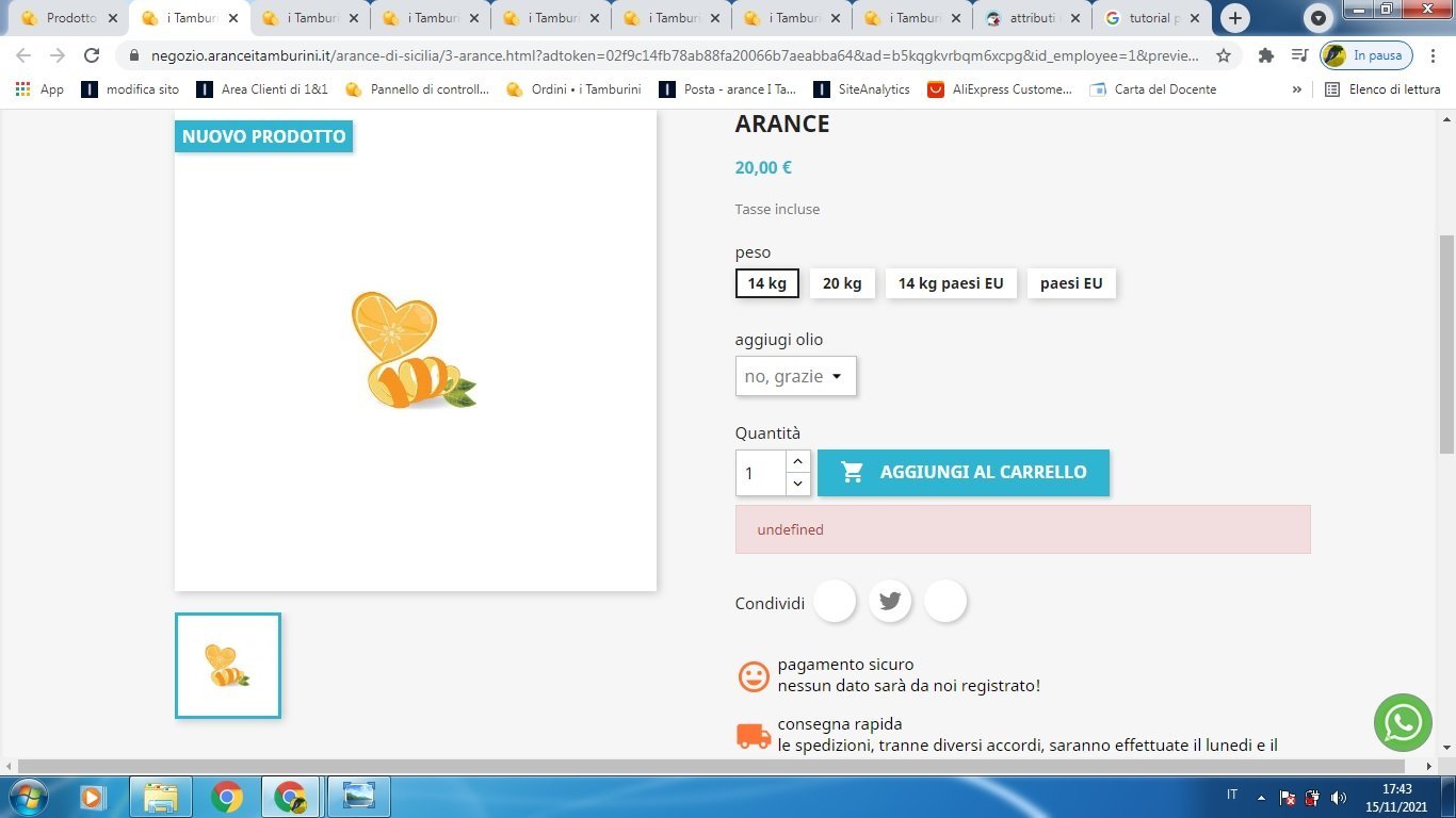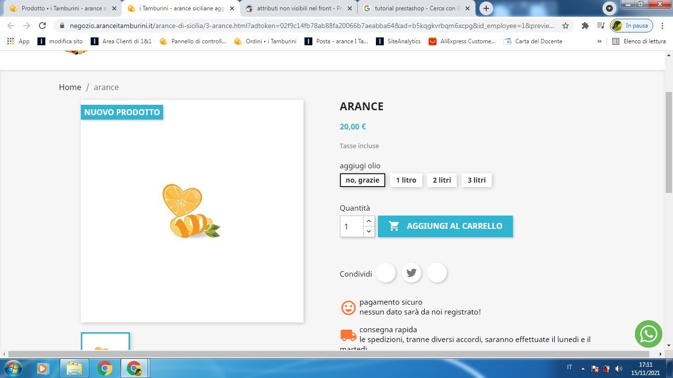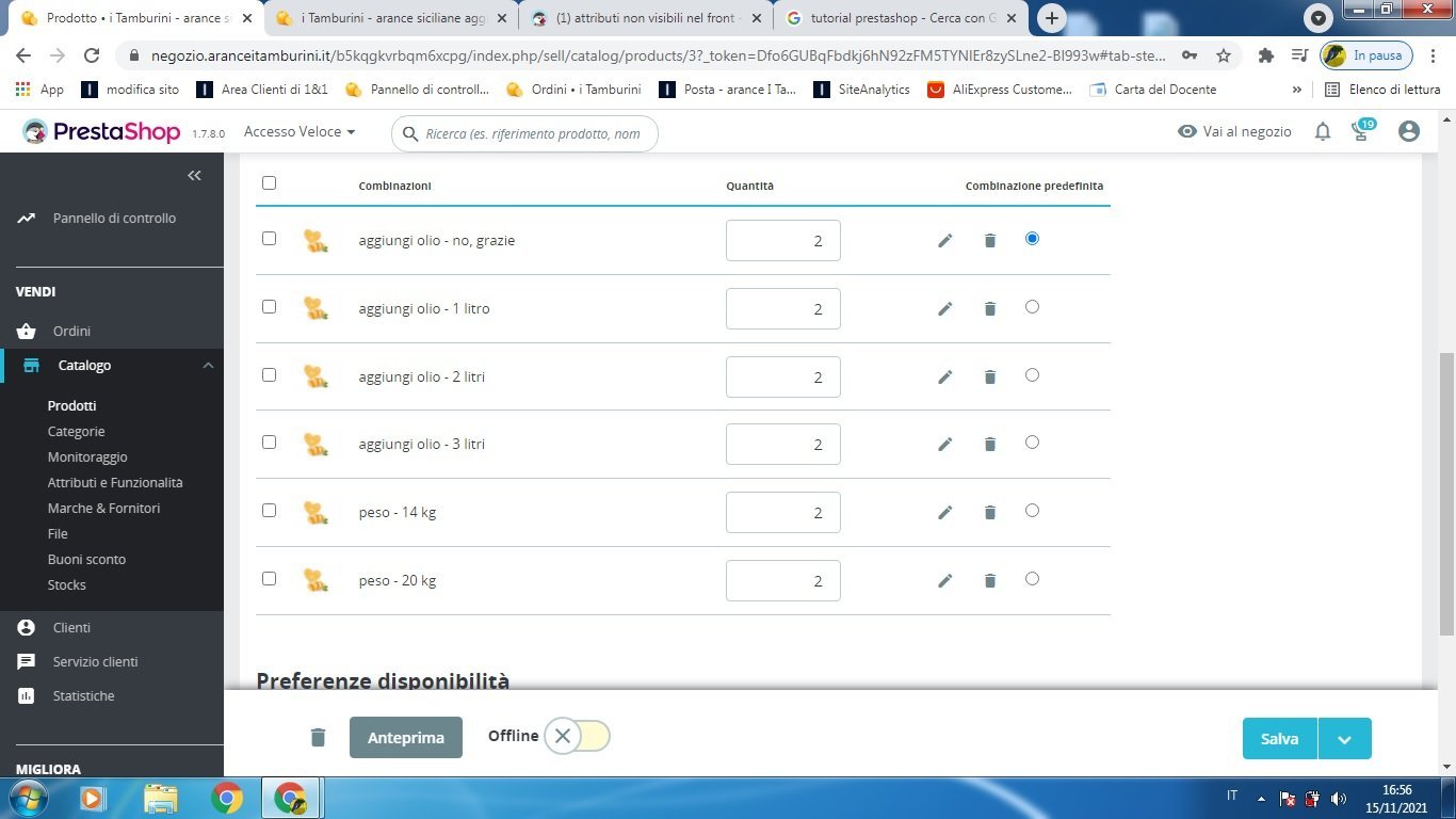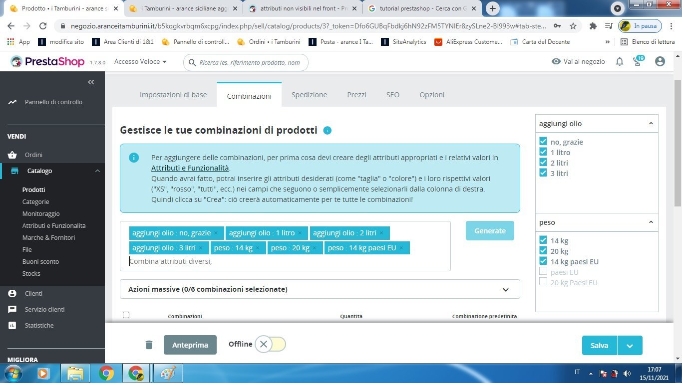 antonio Posted November 15, 2021 Author Share Posted November 15, 2021 la sequenza che ho fatto è: 1) crea attributi "peso" e "aggiungi olio" 2) sviluppare gli attribuiti ("14kg", "20kg" per "peso" e "no grazie" 1litro" ecc per "aggiungi olio" nella pagina admin nella sezione combinazioni ho generato le combinazioni (ho provato anche a fare prima "peso" e poi l'altra) e alla fine ho tutti gli attributi nell'admin ma non nella pagina frontoffice ti posto le immagini della sequenza: Link to comment Share on other sites More sharing options...