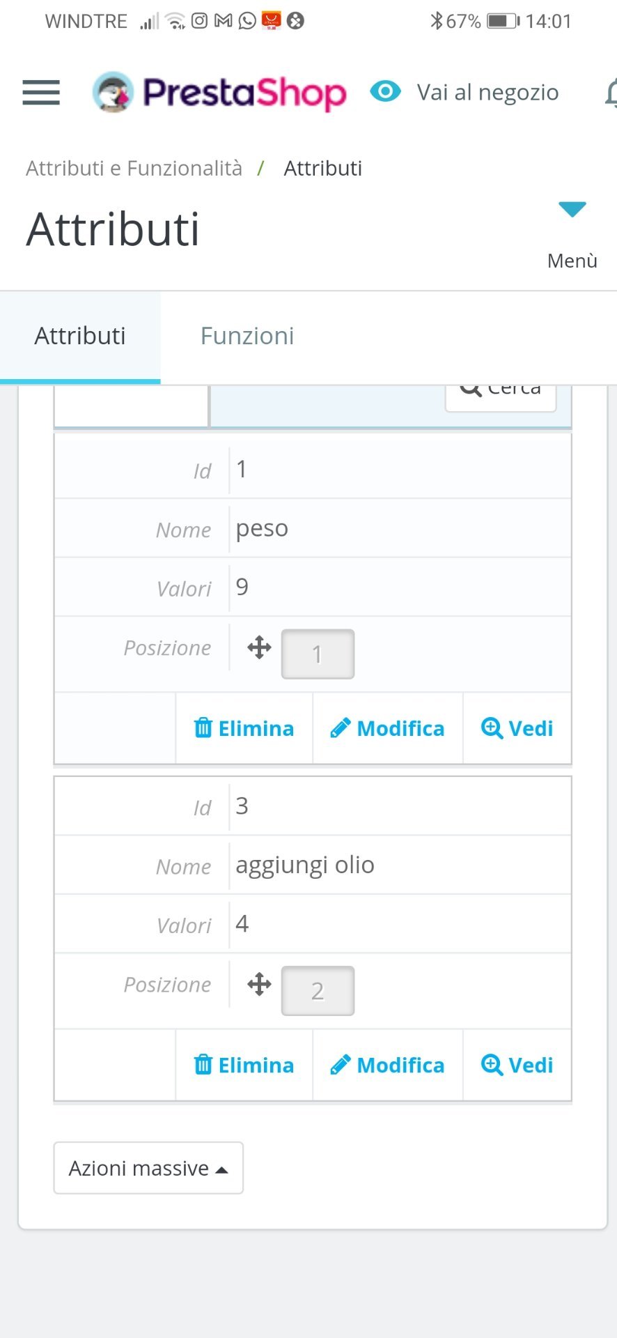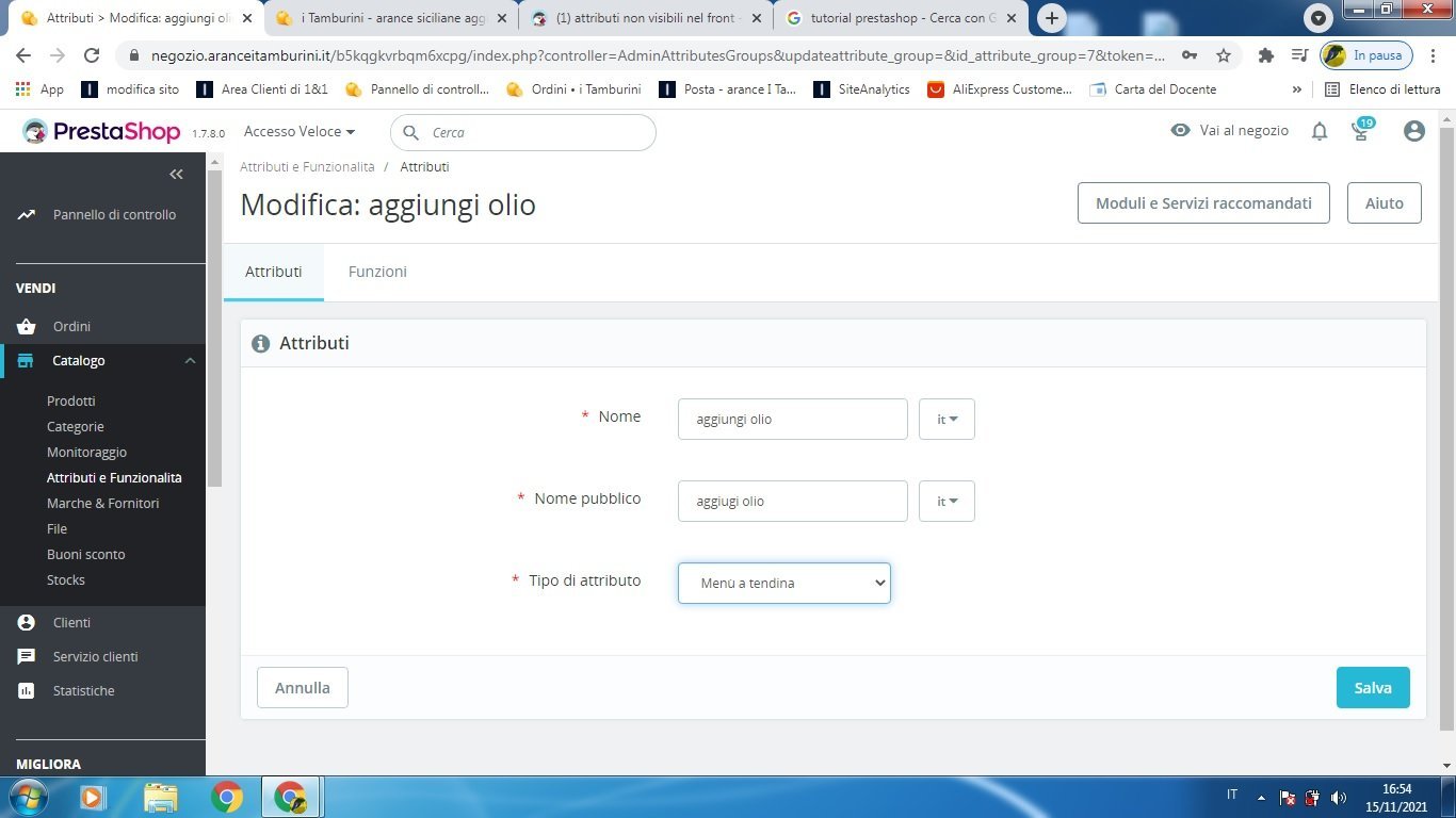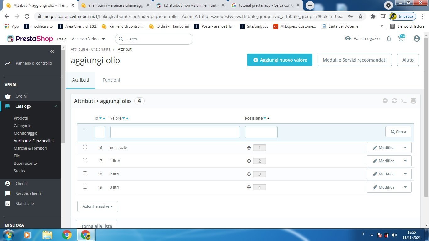 antonio Posted November 15, 2021 Author Share Posted November 15, 2021 la sequenza che ho fatto è: 1) crea attributi "peso" e "aggiungi olio" 2) sviluppare gli attribuiti ("14kg", "20kg" per "peso" e "no grazie" 1litro" ecc per "aggiungi olio" nella pagina admin nella sezione combinazioni ho generato le combinazioni (ho provato anche a fare prima "peso" e poi l'altra) e alla fine ho tutti gli attributi nell'admin ma non nella pagina frontoffice ti posto le immagini della sequenza: Link to comment Share on other sites More sharing options...