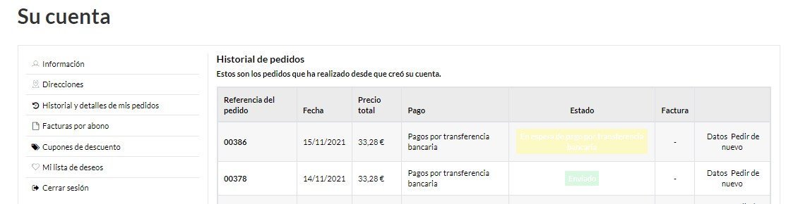 JoseTapia Posted November 15, 2021 Share Posted November 15, 2021 (edited) Buenas a todos, Por algún motivo, el texto que aparece desde la cuenta de los clientes para el estado de sus pedidos en el historial de pedidos es blanco, y sobre los colores de algunos estados de pedido de mi tienda resulta difícil leer el texto. Adjunto foto ilustrativa. He revisado diversos post del foro pero la mayoría de cuestiones sobre el color del texto es referente a la descripción de productos u otros aspectos de la web. ¿Es posible hacer este texto negro, o la única opción es cambiar los colores de los estados? Muchas gracias de antemano, Jose Luis Edited November 17, 2021 by JoseTapia SOLUCIONADO (see edit history) Link to comment Share on other sites More sharing options...