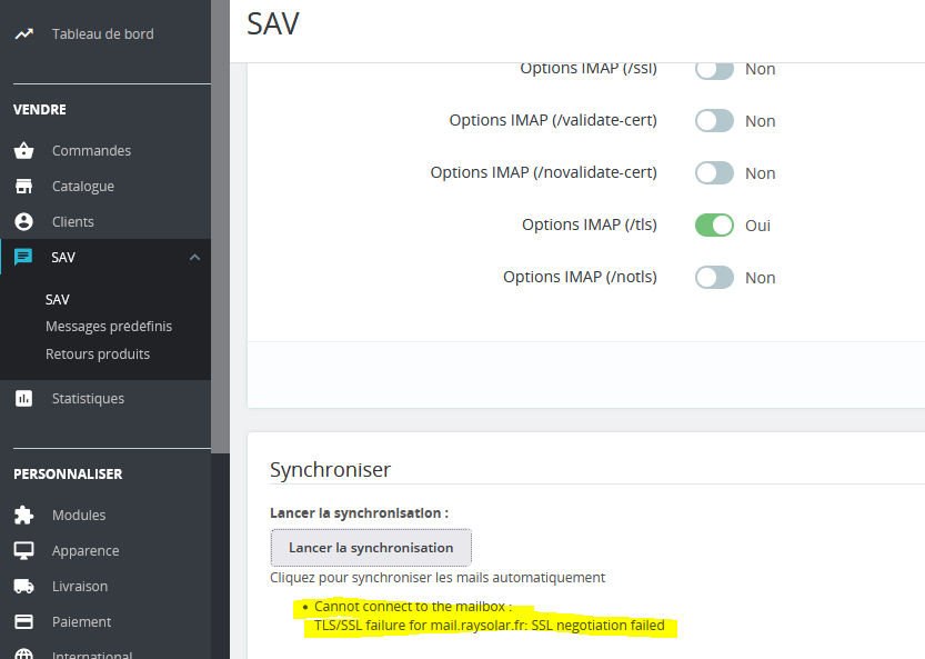 SAV mail integration doesn't work with STARTLS in prestashop version 1.7.8.0.