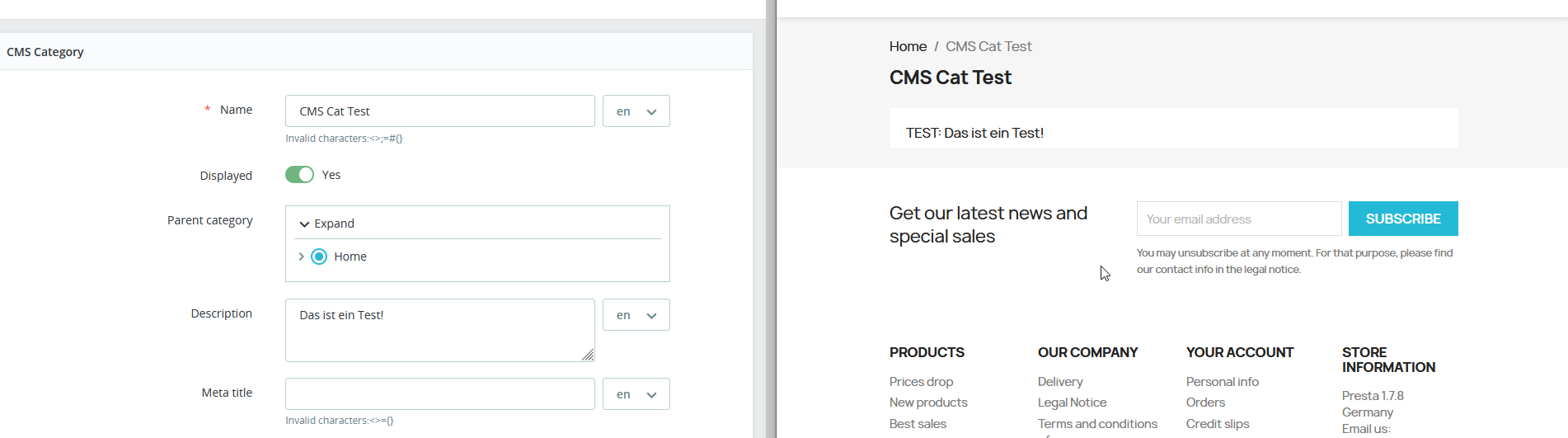 henner2605 Posted November 19, 2021 Author Share Posted November 19, 2021 (edited) Habe jetzt verschiedene Varianten ausprobiert - wie gesagt, ich hab Null Ahnung von den Template Codes. Bestes Ergebnis, es hat sich gar nichts verändert. Schlechtetstes Ergebnis, die Seite war zur Gänze nicht mehr da. Das hier, habe ich mir gedacht, könnte zielführend sein. Passiert aber gar nichts. {block name='category_description'} {$cms_category.description} {/block} Eine Unterkatgorie habe ich eben noch angelegt, die wird korrekt im Frontend angezeigt. Genauso unformiert zwar, aber sichtbar. Edited November 19, 2021 by henner2605 Unterkategorie (see edit history) Link to comment Share on other sites More sharing options...