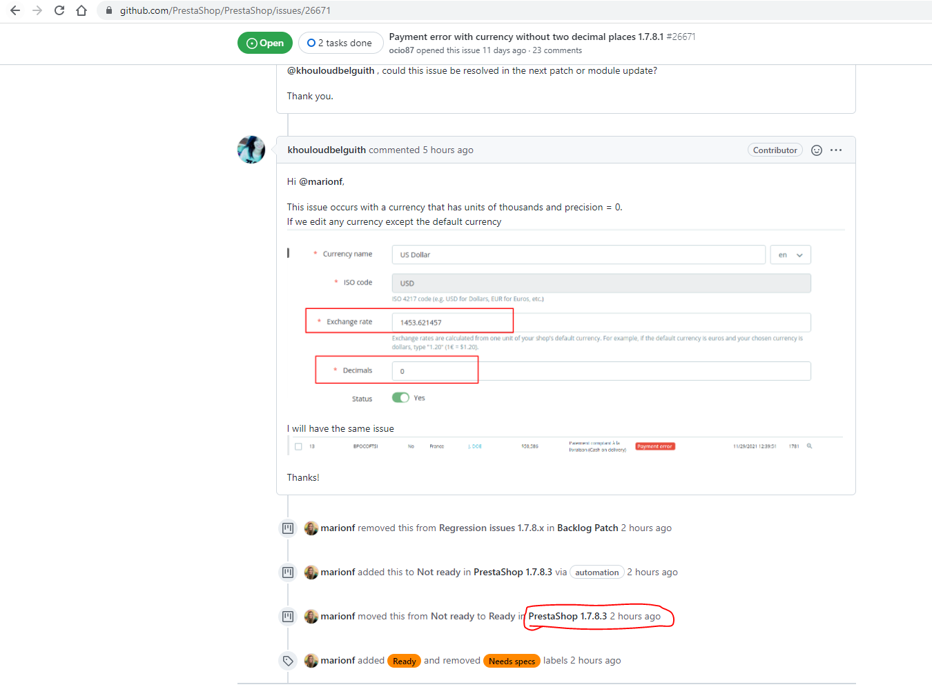 miguel.canedo.mx Posted November 25, 2021 Author Share Posted November 25, 2021 (edited) 1 hour ago, ocio87 said: Hola, les comento mi caso el cual es similar. Hice un ambiente de pruebas. Actualicé de la versión 1.7.7.8 a la versión 1.7.8.1. Cuando lo actualizo con todos los datos como clientes, direcciones, productos, pedidos, etc, este al momento de realizar un pedido desde el front office con moneda Peso Colombiano sin decimales, este arroja error de pago. Si le configuro para que tenga dos decimas, este si crea el pedido sin problemas y en el estado correcto. Debido a esto, hice una actualización limpia de la versión 1.7.8.1, realicé pedidos con moneda colombiana tanto con decimas como sin decimas y en ambos casos hizo el pedido exitoso. Importé Clientes, productos, moneda, paises configurados, realicé un pedido con los productos importados y realizó el pedido sin problemas. Importé todo lo relacionado al historial de pedidos y a partir de ahí empezó a generar error de estado con la creación de pedidos. Al parecer hicieron un cambio en la lógica de Decimas en el core con la versión 1.7.8.1. Monté caso en Github y al parecer demora. https://github.com/PrestaShop/PrestaShop/issues/26671 Les agradezco a los que también les pase que vayan agregando evidencias para ver si realizan la regresión lo más pronto posible ya que tengo poco conocimiento en el manejo del core de prestashop. En mi caso la tienda está configurada en Pesos Mexicanos MXN, Y tampoco uso decimales, He encontrado un patrón: Los montos de 3 dígitos, es decir 999 ó menos funcionan bien. Los montos de 4 dígitos o más, es de cir de 1,000 en adelante generan el error "Supongo" que tiene algo que ver con la utilización de la coma "," como separador de miles y el punto "." como separador de decimales: aqui mis casos reales Prestashop PaymentGateway (openpay ó paypal) 1,970 1,970.00 error 1,600 1,600.00 error 11,040 11,040.00 error 767 767.00 OK 922 922.00 OK 41,094 41,094.00 error Podrá ser util esta información? Edited November 25, 2021 by miguel.canedo.mx (see edit history) Link to comment Share on other sites More sharing options...