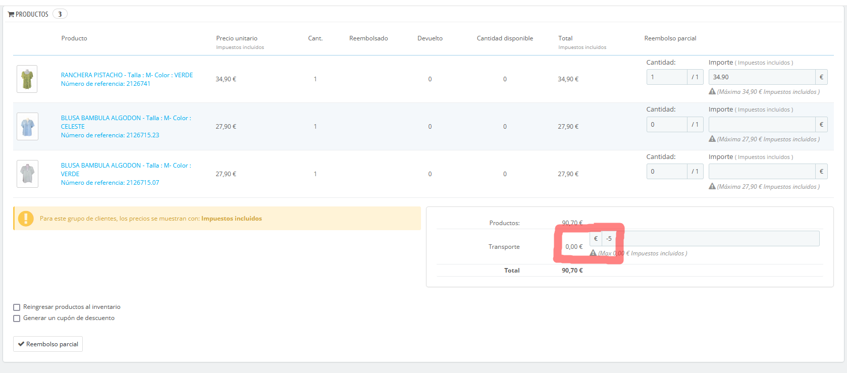 jisas7 Posted November 22, 2021 Author Share Posted November 22, 2021 si lo quiero poner porque el reembolso es de la prenda - envio... porque el envio lo paga la clienta. He probado que en el reembolso hay un campo transporte que le puedes poner una cantidad... si esa cantidad la pones en negativo la descuenta automaticamente del total... Lo unico que luego en el documento no aparece el campo transporte... solo que el total: que piensas como solucion? Link to comment Share on other sites More sharing options...