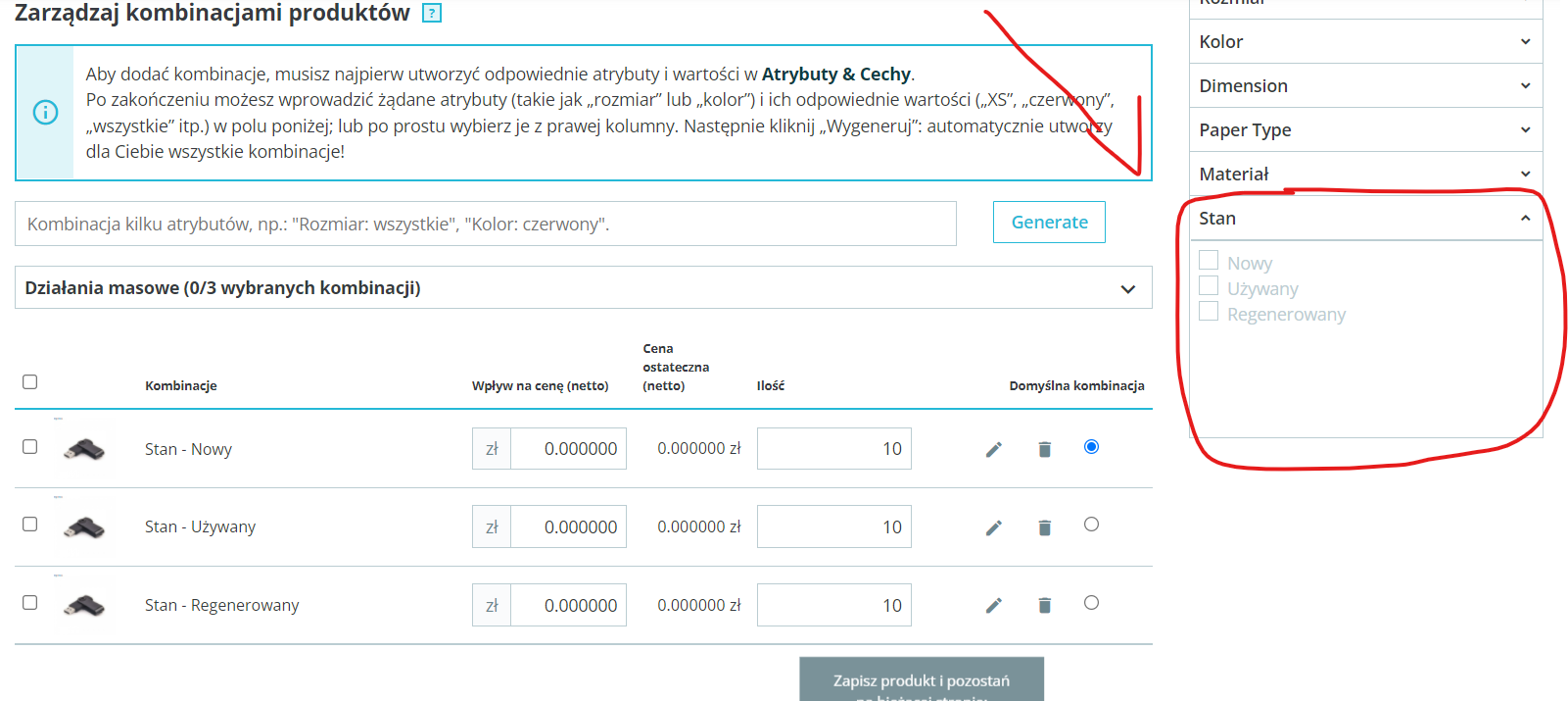 0 squni Posted November 25, 2021 Share Posted November 25, 2021 Żeby mieć do wyboru atrybut (nowy, używany, regenerowany) trzeba wykonać kilka kroków: 1. W panelu administatora -> katalog -> Atrybuty&cechy: a) stworzyć atrybut 'stan' b) w atrybucie 'stan' dodać wartości nowy, używany, regenerowany 2. Katalog -> produkty -> wybieramy produkt a) zaznaczamy opcję 'Produkt z kombinacjami' b) W zakładce 'Kombinacje' wybieramy odpowiedni atrybut i klikamy 'Generate' c) Po utworzeniu wszystkich kombinacji można ustawić resztę wartości dla danej kombinacji Widok na karcie produktu: Link to comment Share on other sites More sharing options...