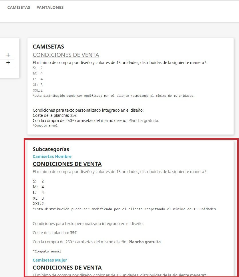Flamberge Posted December 28, 2021 Share Posted December 28, 2021 (edited) Buenos días, Soy completamente nuevo en esto de las páginas web y debido a toda esta situación he tenido que reinventarme un poco y hacer un página web por mi mismo. Pues bien, ya tenía mi página acabada y bien bonita. He ido a mi panel de hosting (contraté con Loading) y he actualizado la página de prestashop a la última versión. No me ha gustado que al actualizar se me hayan cambiado cosas automáticamente en la web, como por ejemplo en la página de inicio se me han añadido 2 módulos nuevos de "LO MÁS VENDIDOS" y "NOVEDADES". Cosa que me gusta y dejaré pero ahora me da miedo actualizar de nuevo y que me toque cosas que no quiero. También se me ha cambiado que cuando pulso en una categoría de Inicio, por ejemplo "CAMISETAS" me aparecen todas las subcategorías con sus descripciones... yo sólo quiero que me aparezca la descripción de la categoría "CAMISETAS" y no las otras... no consigo encontrar cómo quitarlas: Muchas gracias por vuestra ayuda de antemano y perdón por el rollo jeje. Por cierto, como he dicho anteriormente, soy completamente nuevo en esto, no soy informático ni nada y no sé ni siquiera restaurar una copia de seguridad ni nada... de hecho creo que mi host las hace automáticamente pero ni idea de que fecha es. En fin, si alguien le echa un ojo y me puede ayudar se lo agradecería de corazón. Un saludo Edited December 28, 2021 by Flamberge Solucionado 1 problema, me falta otro (see edit history) Link to comment Share on other sites More sharing options...