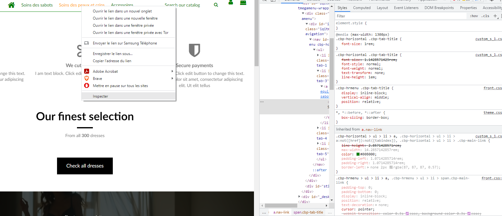 Nukem38 Posted January 20, 2022 Author Share Posted January 20, 2022 (edited) Il y a 3 heures, Prestashop Addict a dit : Lorsqu'il y a un thème spécifique, il faut voir avec le développeur du thème ou l'agence pour le support. 🙂 Merci d'avoir pris le temps de me répondre. J'ai déjà demandé, en réponse : "hello, it is not possible to higlight active tab, since it is not equal to any controller" Je cherche un développeur pour le code CSS à insérer. Cela ne doit pas être bien compliqué pour celui qui sais faire. Ca devrait ressembler à un truc comme ça mais je ne sais pas l'adapter sur mon thème : (ca viens du module top menu) #adtm_menu .li-niveau1 a.advtm_menu_actif .advtm_menu_span { color: #macouleur; text-decoration: #monfond; } "#adtm_menu .li-niveau1 a.advtm_menu_actif .advtm_menu_span" est donc faux mais je pense que c'est la seul piste que j'ai, adapter avec IQITMEGAMENU En faisant Inspecter sur la partie concerné, peux être quelqu'un m'aidera à trouver : Edited January 20, 2022 by shep68 (see edit history) Link to comment Share on other sites More sharing options...
