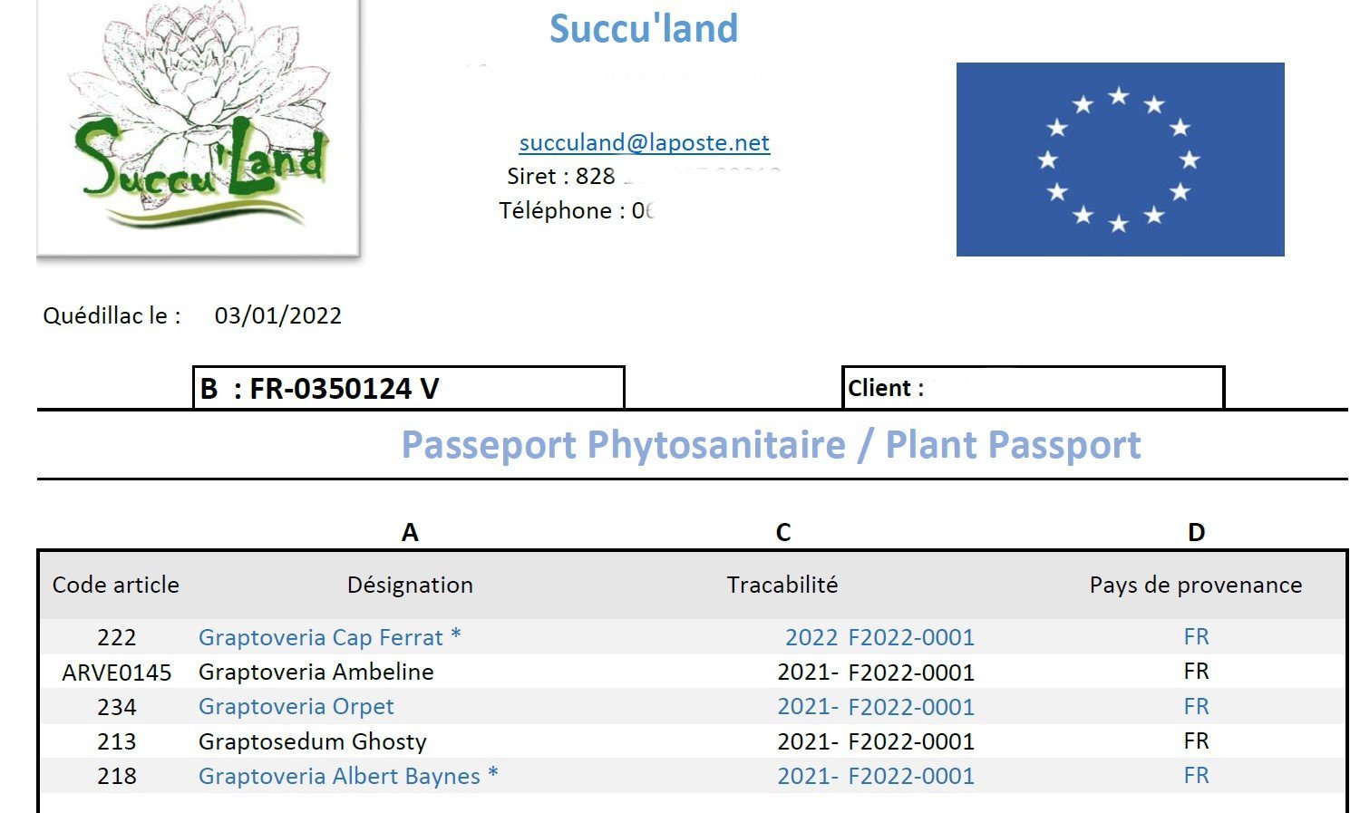 jom2 Posted January 22, 2022 Share Posted January 22, 2022 Bonjour Nous préparons une boutique pour vendre des plantes succulentes et autres cactus. Chaque facture doit être accompagnée d'un certificat phytosanitaire. Il doit comporté des infos sur les plantes et en assurer le suivi, la provenance .... en piece jointe un exemple. Savez vous si il y a déjà quelque chose de créé dans ce sens ? 1 Link to comment Share on other sites More sharing options...
