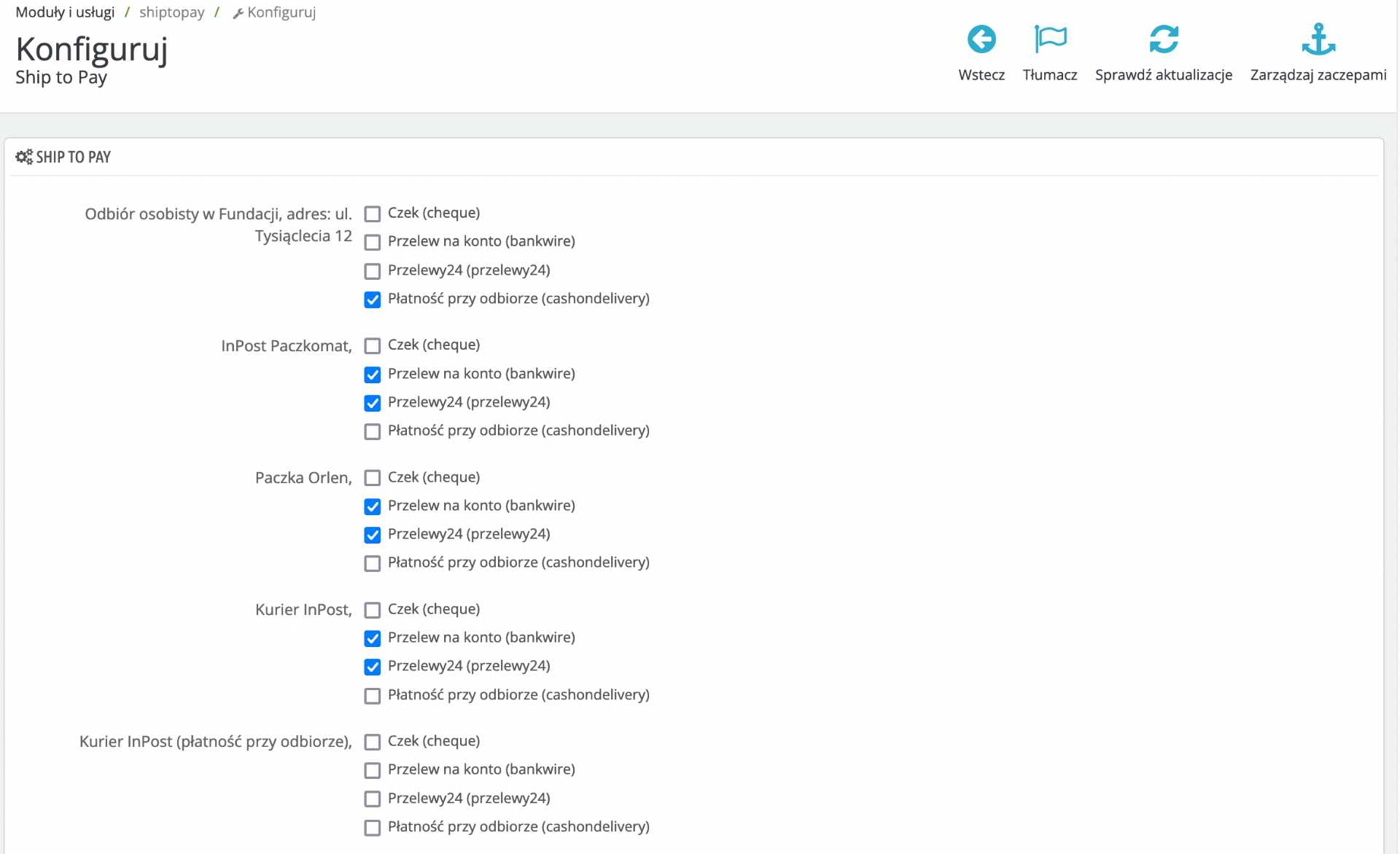 0 samioz Posted February 12, 2022 Author Share Posted February 12, 2022 12 hours ago, ComGrafPL said: Tutaj masz: Dziękuję za odpowiedź, niestety dalej nie mogę tego zrealizować, posiadam już wtyczkę Ship to Pay w wersji 2.0, w załączniku screeny. Mam to skonfigurowane, zrobiłem nowego własnego Przewoźnika Odbiór osobisty w Fundacji i dałem w Ship to Pay tylko cashondelivery. Niestety po stronie sklepu dalej mam wysyłkę, za pomocą tylko Orlen Paczka i Inpost z Furgonetki. Nie mam tam Odbiór osobisty w Fundacji, natomiast w Płatnościach mam Zapłać przy odbiorze, natomiast nie ma to sensu, bo ktoś najpierw musi wybrać Wysyłkę, a następnie Płatność. Jeśli tak zrobię to w panelu mam wybranego Przewoźnika na przykład InPost a płatność Płatność przy odbiorze. Przecież tak nie mogę tego zostawić... Macie jakiś pomysł? Czy ja coś źle robię? Link to comment Share on other sites More sharing options...