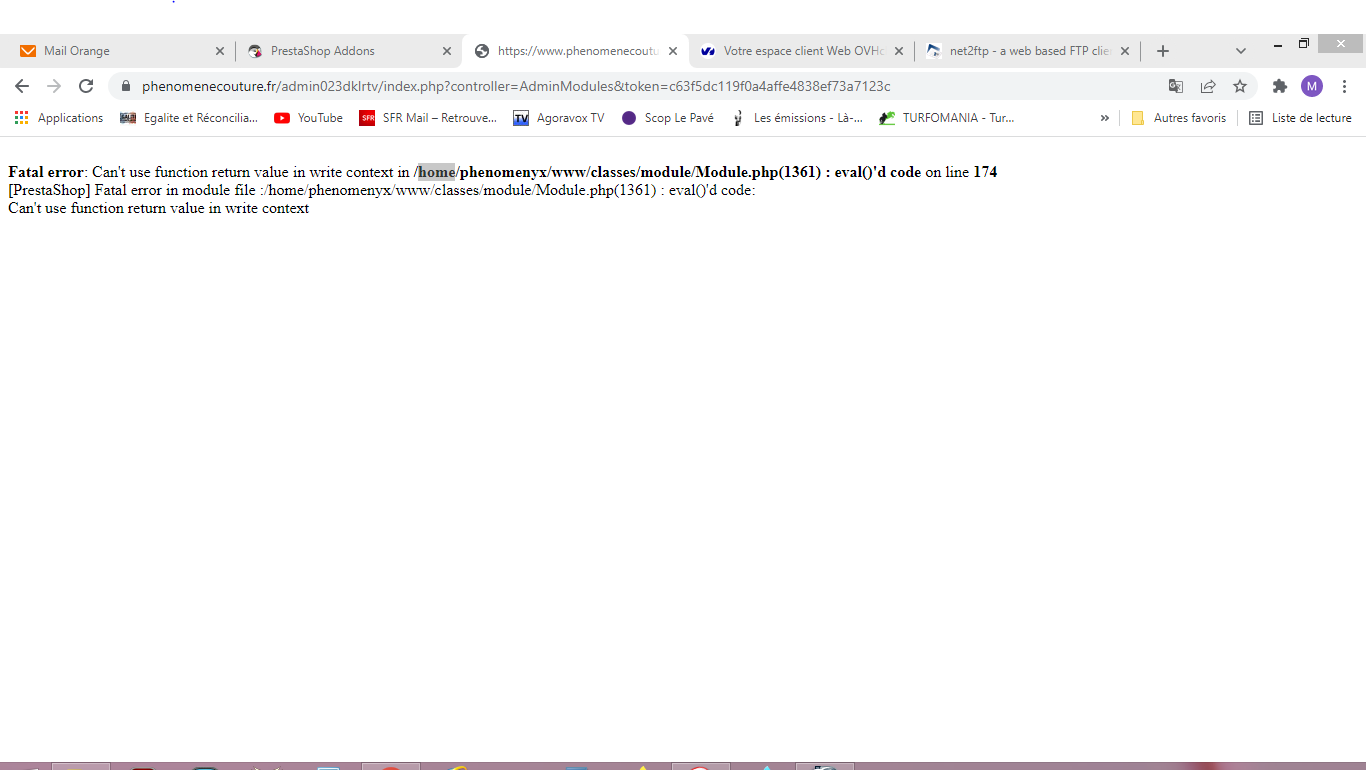 Phenomene Posted March 9, 2022 Author Share Posted March 9, 2022 En cherchant sur internet, il faut aussi regarder ce qui est inscrit à la ligne 1361 Fatal error: Can't use function return value in write context in /home/phenomenyx/www/classes/module/Module.php(1361) : eval()'d code on line 174 [PrestaShop] Fatal error in module file :/home/phenomenyx/www/classes/module/Module.php(1361) : eval()'d code: Can't use function return value in write context La ligne 1361 foreach ($modules_dir as $module) { if (Module::useTooMuchMemory()) { $errors[] = Tools::displayError('All modules cannot be loaded due to memory limit restrictions, please increase your memory_limit value on your server configuration'); break; Faut-il augmenter la limite de la mémoire aller dans le php.ini et modifier ? ini_set(‘memory_limit’,’128M’); Est-ce qu'en augmentant la limite cela règlera l'erreur à la ligne 1361 et 174 ? Ou faut-il que je modifie ces lignes ? Merci pour votre aide Link to comment Share on other sites More sharing options...