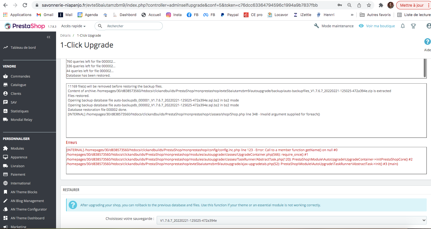MarieNIAP Posted February 21, 2022 Share Posted February 21, 2022 Bonjour, J'ai voulu faire la mise jour vers la version 1.7.8.3. depuis 1 click Upgrade. Ma boutique ne s'affichait plus comme avant alors j'ai décidé de faire retour arrière en restaurant ma sauvegarde. Et là, ma boutique ne s'ouvre plus et je n'ai même plus accès à mon dashboard, l'error 500 s'affiche. Voici en pièce jointe la capture d'écran des erreurs qui sont apparus après la restauration de la sauvegarde. Que dois-je faire pour rétablir tout ça ? Merci pour votre aide ! Link to comment Share on other sites More sharing options...