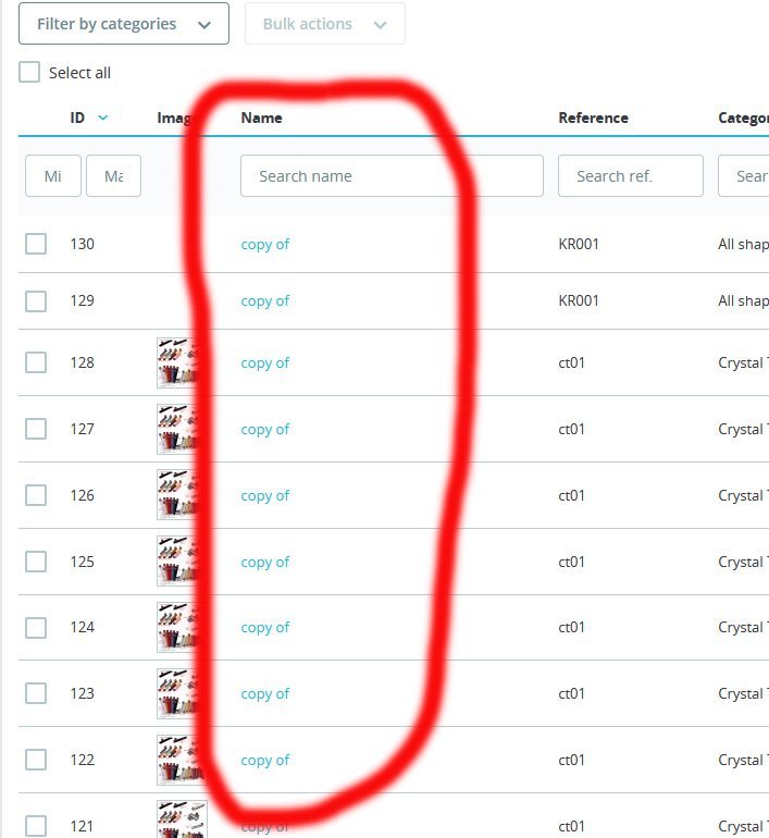 Czy ktoś się spotkał z podobnym przypadkiem jak na zdjęciu? Na liście produktów zamiast odpowiedniej nazwy pojawia się wszędzie "copy of" (jeśli robisz duplikat) lub "N/A" (jeśli dodajesz nowy produkt). Prawidłowo pokazuje się nazwa w produkcie i w sklepie, tylko na liście, gdzie są wszystkie produkty nie.