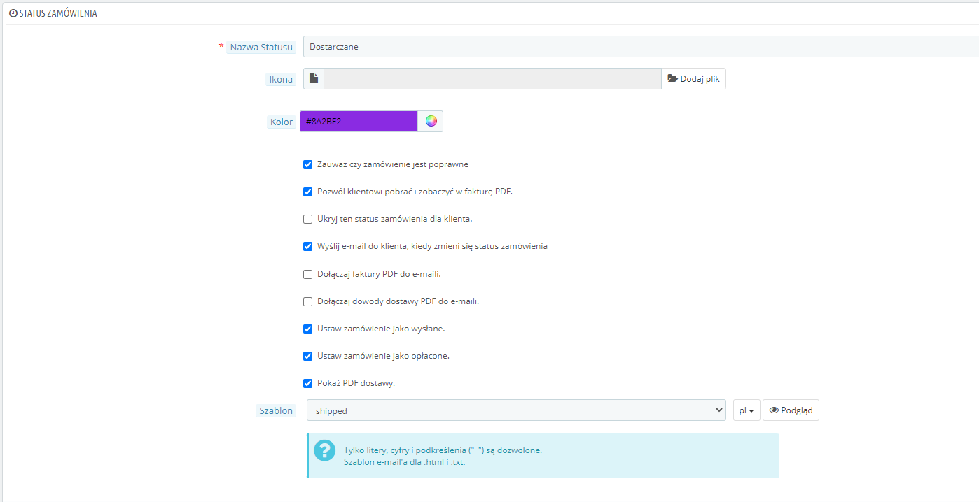 Dodam, że w edycji statusów (Panel Presty -> Preferencje -> Zamówienia -> Statusy -> Dostarczane nie ma tam żadnego pola z imieniem i nazwiskiem: