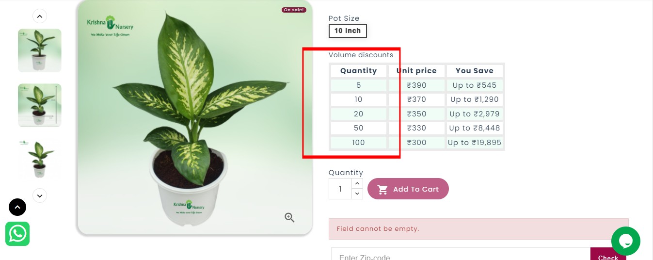 averma82 Posted March 29, 2022 Author Share Posted March 29, 2022 Dear @knacky Thanks for showing interest in my query. I don't have much programming knowledge except the basic level in HTML/CSS/JS. Prestashop Version : 1.7.8.5 Yes the rule will apply to all the products but the quantity selection may differ as per requirements in the volume discount list block. We are using a purchased template and not the default one. Template Name: "Nursery Plant & Tools" from "TemplateTrip" Website: https://krishnanursery.in/ Pls let me know if anything else is required. Thanks & Regards. Link to comment Share on other sites More sharing options...
