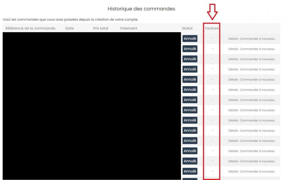 Divine Posted April 1, 2022 Share Posted April 1, 2022 Bonjour, Fichier "history.tpl" dans le dossier templates >> customer du thème. Commentez ou supprimez les lignes : <th>{l s='Invoice' d='Shop.Theme.Checkout'}</th> Ainsi que les lignes : <td class="text-sm-center hidden-md-down"> {if $order.details.invoice_url} <a href="{$order.details.invoice_url}"><i class="material-icons"></i></a> {else} - {/if} </td> Le mieux étant de le faire depuis un thème enfant afin de ne pas perdre cette modification en cas de mise à jour du thème. 1 Link to comment Share on other sites More sharing options...