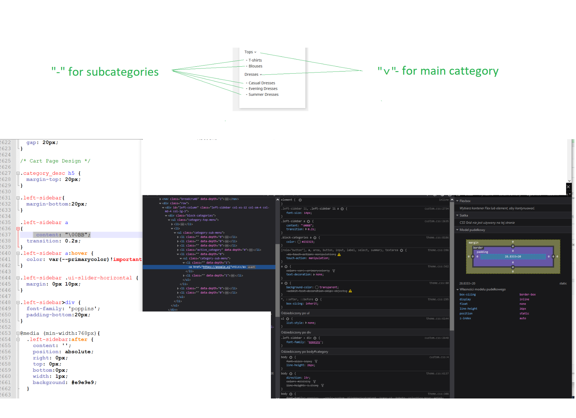 Tomi14 Posted April 3, 2022 Author Share Posted April 3, 2022 (edited) Thank you very much! Now everything is colaped like I want But second question is, how to get special char "ˬ" after main category , and "-" before all subcategories? Im not so familiar with css too :< When I put for example "content: "\00BB" in .left-sidebar and refresh cache and reload page - nothing happen Edited April 3, 2022 by Tomi14 (see edit history) Link to comment Share on other sites More sharing options...