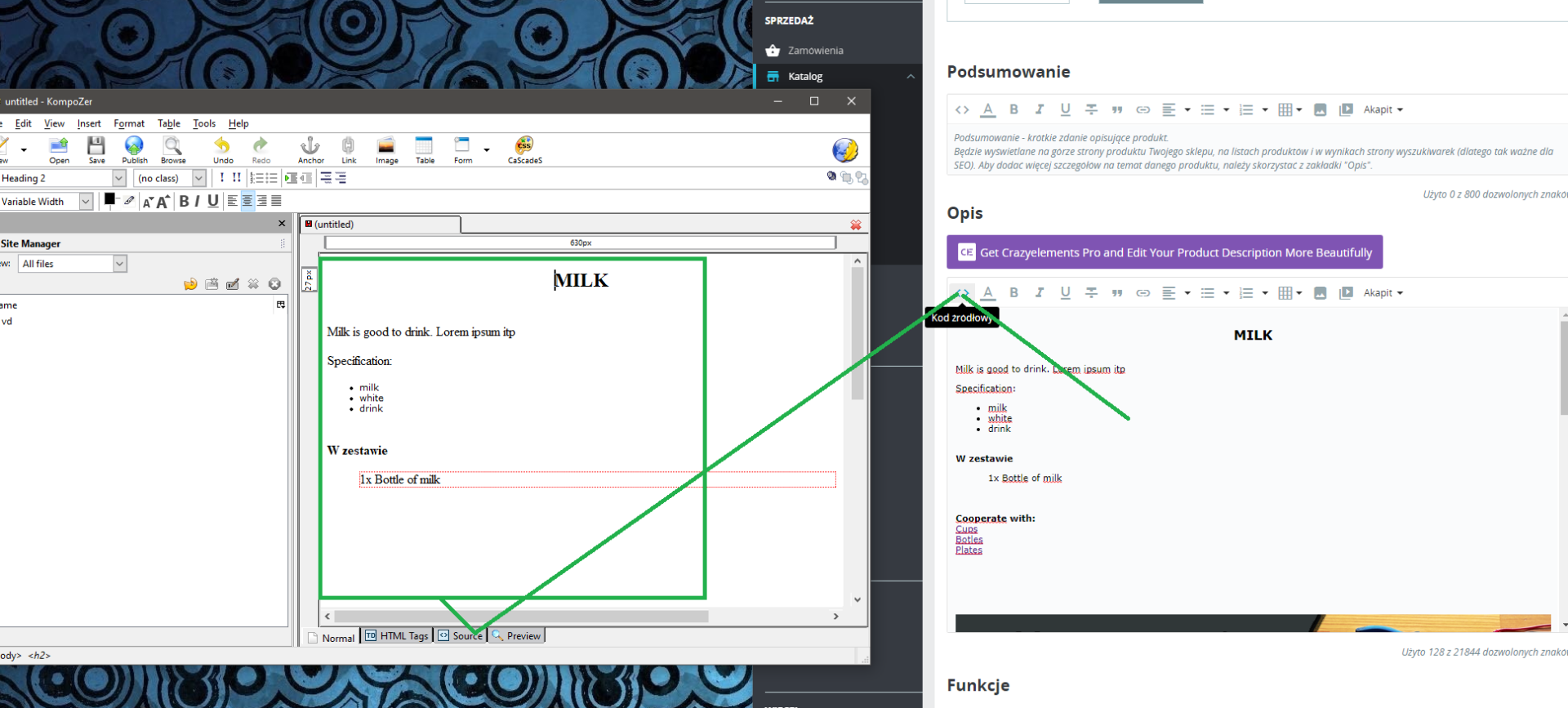 Tomi14 Posted April 5, 2022 Share Posted April 5, 2022 Im trying to add products, but it is too slow. I have something about 500 products to add. 1) I use Kompozer to create a text description with bullets and smaller font size in specifation (which I am unable to do in presta standard text editor). 2) Switch to source tab, copy html, and paste it to presta text editor in "source". 3) Later I trying to add photos bellow my main description with short text on it side. But everything moving out and it is terrible. I know - everthing is my foult, but I need some solution Im trying to use CSV export, but I cant prepare description in Kompozer with photos from my web page ftp, and manualy coping links to each photo will takes hours. Attachments: 1) Kompozer 2) How I want to my product description look with photos Link to comment Share on other sites More sharing options...