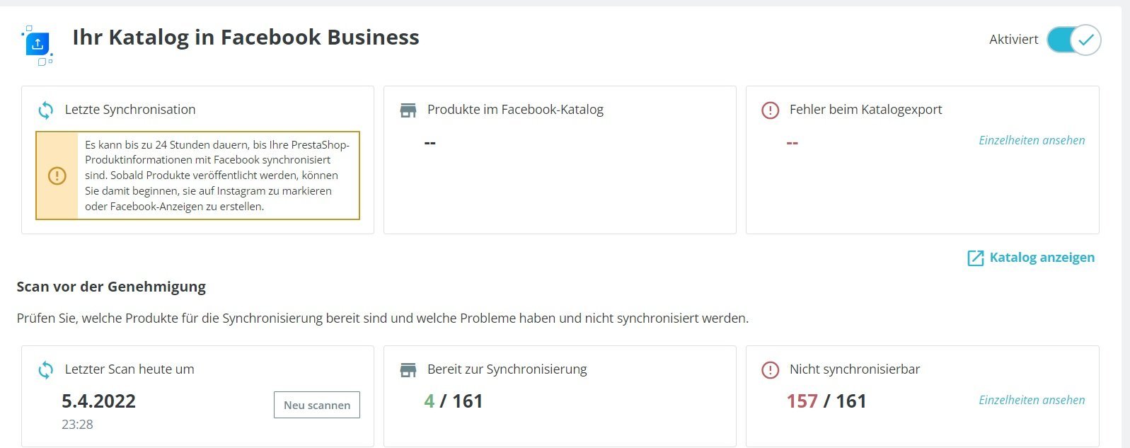 Markus_E Posted April 5, 2022 Share Posted April 5, 2022 Hallo, ich habe das Facebook-Modul installiert und möchte meine Artikel mit Facebook synchronisieren. Leider werden die Artikel nicht in den Produktkatalog bei Facebook übertragen. Seit Tagen steht im Prestashop folgende Meldung:"Es kann bis zu 24 Stunden dauern, bis Ihre PrestaShop-Produktinformationen mit Facebook synchronisiert sind. Sobald Produkte veröffentlicht werden, können Sie damit beginnen, sie auf Instagram zu markieren oder Facebook-Anzeigen zu erstellen." Bei Facebook ist de Produktkatalog leer und die Artikel werden nicht übertragen. Es sollten meines Erachtens 4 Artikel mit Facebook synchronisiert werden. Wo liegt der Fehler? Danke für die Hilfe. Liebe Grüße Markus Link to comment Share on other sites More sharing options...