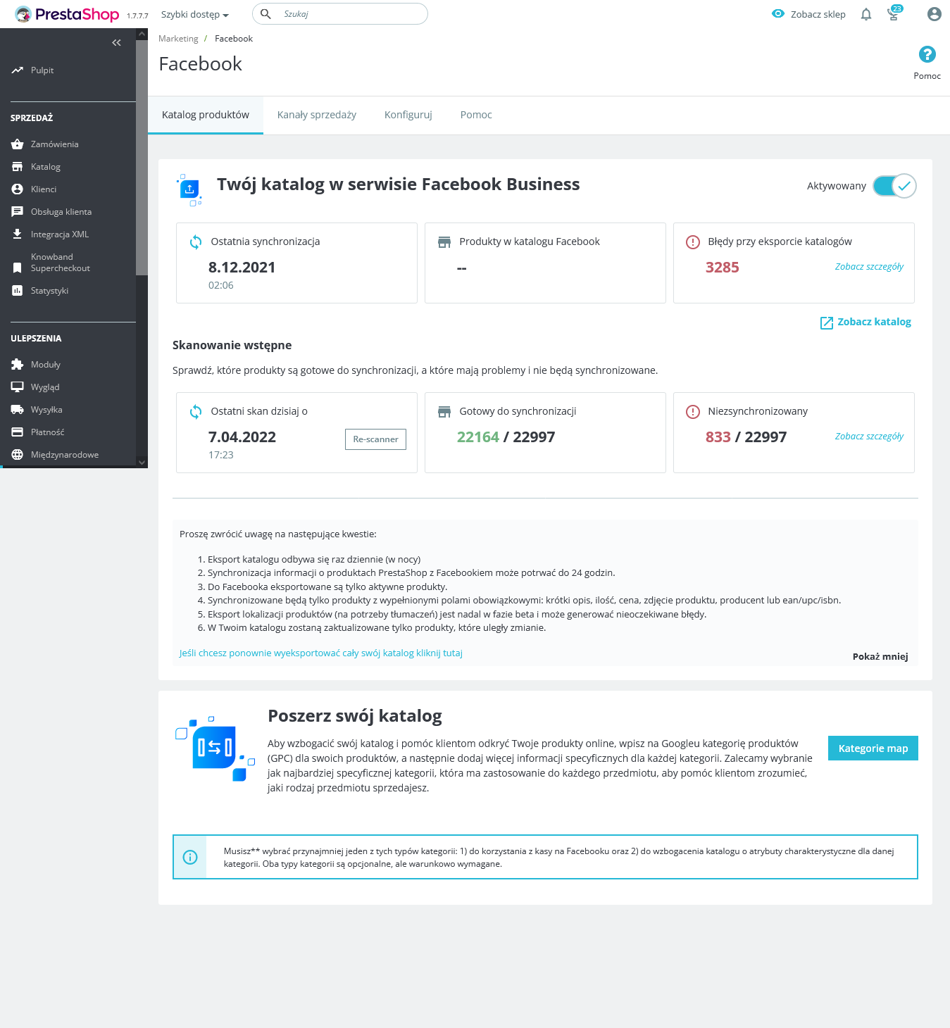 Mam problem z dodatkiem ps facebook. Nie wiem czemu nie chce mi dodać produktów do katalogu. O 4 dni, wszystko usuwam dodaje raz jeszcze i nic... W zeszłym roku na innym koncie fb odbyło się to bez problemu. Zmienił się jednak asortyment sklepu i docelowe konto na fb stąd zmiana. Niestety jak dotąd bez skutków. Co może być nie tak? Wygląda to tak jak w załączniku.