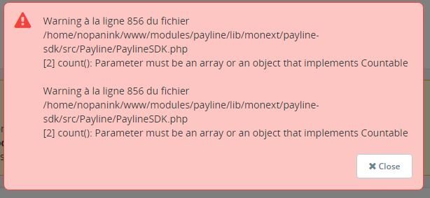 FLTNRMDIA Posted April 12, 2022 Author Share Posted April 12, 2022 J'ai effectué la modification, je n'ai plus cette ligne d'erreur ! En revanche j'en ai de nouvelles 😅 Quote Warning à la ligne 180 du fichier /home/nopanink/www/modules/payline/class/PaylinePaymentGateway.php [2] Illegal string offset 'label' Quote Notice à la ligne 180 du fichier /home/nopanink/www/modules/payline/class/PaylinePaymentGateway.php [8] Uninitialized string offset: 0 Quote Warning à la ligne 1465 du fichier /home/nopanink/www/modules/payline/payline.php [2] Illegal string offset 'label' Quote Warning à la ligne 1466 du fichier /home/nopanink/www/modules/payline/payline.php [2] Illegal string offset 'label' Et d'autres mais je vais pas tout mettre pour éviter de spam le topic.. J'ai remis la config précédente et voir directement avec Citélis pour régler le soucis pour éviter de trop magouiller les fichiers du modules. Merci pour l'aide en tout cas ! Link to comment Share on other sites More sharing options...