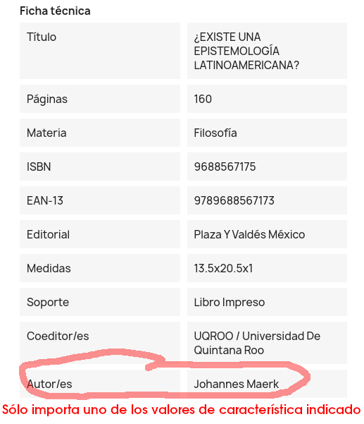 Yeyupa Posted April 18, 2022 Share Posted April 18, 2022 (edited) Vale pues lo conseguí, lo pongo acá por si a alguien le resulta de utilidad. Lo resolví simplemente repitiendo la instrucción de Catacterística tantas veces como sea necesario, es decir, tantas veces como valores de características tengamos, con lo que, siguiendo el ejemplo inicial quedaría... Título:¿EXISTE UNA EPISTEMOLOGÍA LATINOAMERICANA?,Autor/es:Johannes Maerk,Autor/es:Magaly Cabrolié,Autor/es:Autor3,Autor/es:Autor4, Páginas:160, Materia:Filosofía, ISBN:9688567175, EAN-13:9789688567173, Editorial:Plaza y Valdés México, Medidas:13.5x20.5x1, Soporte:Libro impreso, Coeditor/es:UQROO / Universidad de Quintana Roo, Con lo que el resultado queda Autor/es Johannes Maerk Magaly Cabrolié Autor3 Autor4 Y listo, porsupuesto todo en una sola linea. Espero sea util. ----------- POST ORIGINAL Desde ya aprecio cualquier apoyo que me puedan ofrecer… Tengo una instalación de PS 1.7.8.4 de pruebas de manera local, estoy importando una hoja de calculo de 50 productos (de 3500 que necesito) pero me esta importando mal y pues estoy atorado, la tienda es una librería y para detallar la Ficha técnica tengo hasta 12 Características, y en algunas de ellas deben de incluirse más de un valor de característica, por ejemplo, una característica llamada “Autor/es” en la cual hay casos en las que tienen 6 o 7 autores, sin embargo siempre me importa solo uno y no consigo que incluya todos los valores de características que necesito, un ejemplo es el siguiente, para la columna Feature(Name:Value:Position) la exporto como sigue Título:¿EXISTE UNA EPISTEMOLOGÍA LATINOAMERICANA?,Autor/es:Johannes Maerk,Magaly Cabrolié, Páginas:160, Materia:Filosofía, ISBN:9688567175, EAN-13:9789688567173, Editorial:Plaza y Valdés México, Medidas:13.5x20.5x1, Soporte:Libro impreso, Coeditor/es:UQROO / Universidad de Quintana Roo, Por supuesto todo en una sola linea pero en este orden, como se puede ver en este caso la característica “Autor/es” tiene dos valores de característica (autores), estos separados por una coma, en este ejemplo Johannes Maerk y Magaly Cabrolié pero al importar únicamente me importa el valor de característica que esta primero en “Autor/es” y al otro lo ignora. Y pues esa es la pregunta, es posible en una importación incluir más de un valor de característica a su respectíva característica? Gracias nuevamente! Edited May 17, 2022 by Yeyupa Resuelto (see edit history) Link to comment Share on other sites More sharing options...