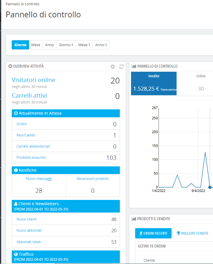 fedesib Posted May 23, 2022 Share Posted May 23, 2022 Ciao, sembra che ci sia qualche problema (noto) riguardo all'aggiornamento del widget delle attività sulla dashboard (https://github.com/PrestaShop/PrestaShop/issues/18014). Forse provando a cambiare da "Giorno" a "Mese" nel pannello sopra, carica le informazioni corrette/aggiornate, dato che deve fare un refresh. Poi dalla visualizzazione "Mese" puoi tornare a quella "Giorno" per vedere le informazioni che ti interessano. Buona giornata, Federica Link to comment Share on other sites More sharing options...