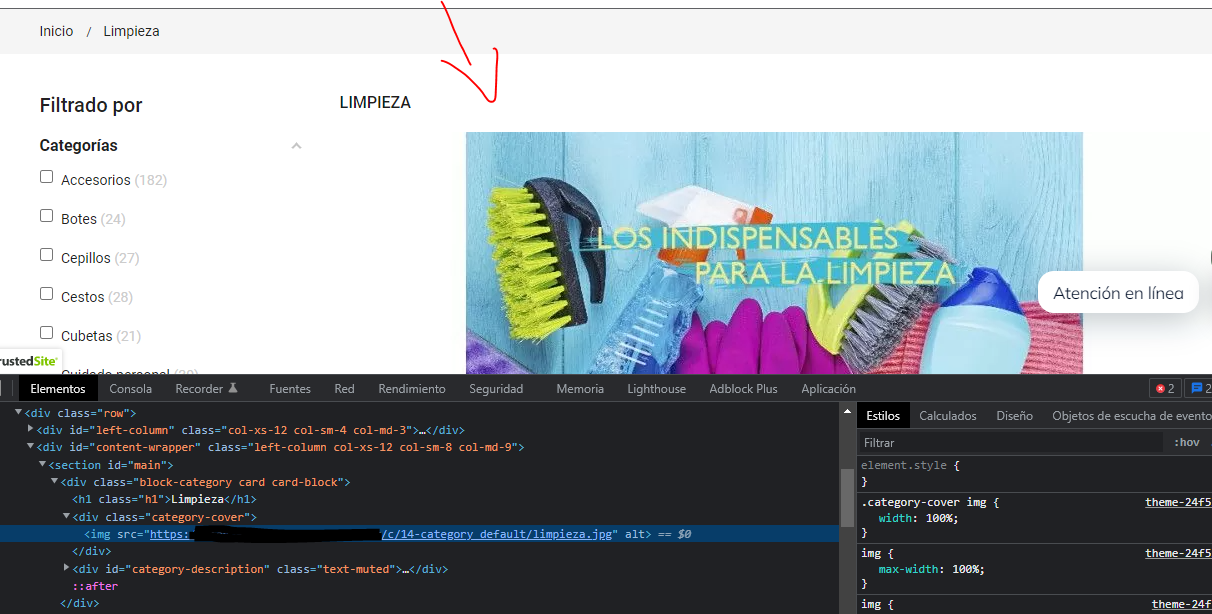Ana22 Posted April 21, 2022 Share Posted April 21, 2022 Hola chicos, estoy intentando cambiar las imágenes de las categorías, esa es la imagen que se debe mostrar en la categoría de limpieza pero al ir a mi tienda en la categoría de limpieza veo la imagen anterior ya borré caché de prestashop, cloudflare y de mi navegador y nada de eso lo soluciona, también intenté ir a la ruta que marca la que se muestra en la tienda pero no la encuentrohttps://miSitio.com/c/14-category_default/limpieza.jpg ¿Alguna idea? :c Link to comment Share on other sites More sharing options...