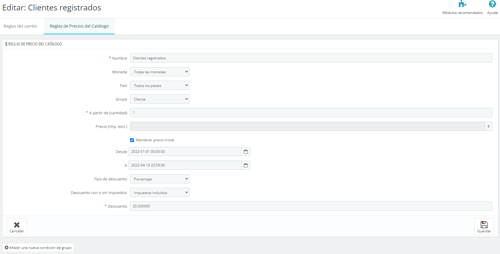 CastelaoSL Posted April 25, 2022 Author Share Posted April 25, 2022 50 minutes ago, joseantgv said: Ten en cuenta que no es posible aplicar más de un precio específico a la vez. ¿Quizás se está aplicando otro en ese momento? Por otra parte, estás utilizando una versión de PS un poco antigua. Si tienes opción de actualizar siempre será mejor. Hola! Lo se! ahora mismo no hay más descuentos. Lo que dice el compañero gusman126 creo que tiene sentido porque he mirado los 2 últimos pedidos en los que no se ha aplicado esta regla del catálogo y el cliente ha pedido 10 o más unidades. Pero esque no se dónde está esa opción de las cantidades. Así es como lo tenemos ahora (la fecha no coincide porque justamente esta semana tenemos otra oferta t a la semana que viene volveremos a esta regla): Link to comment Share on other sites More sharing options...