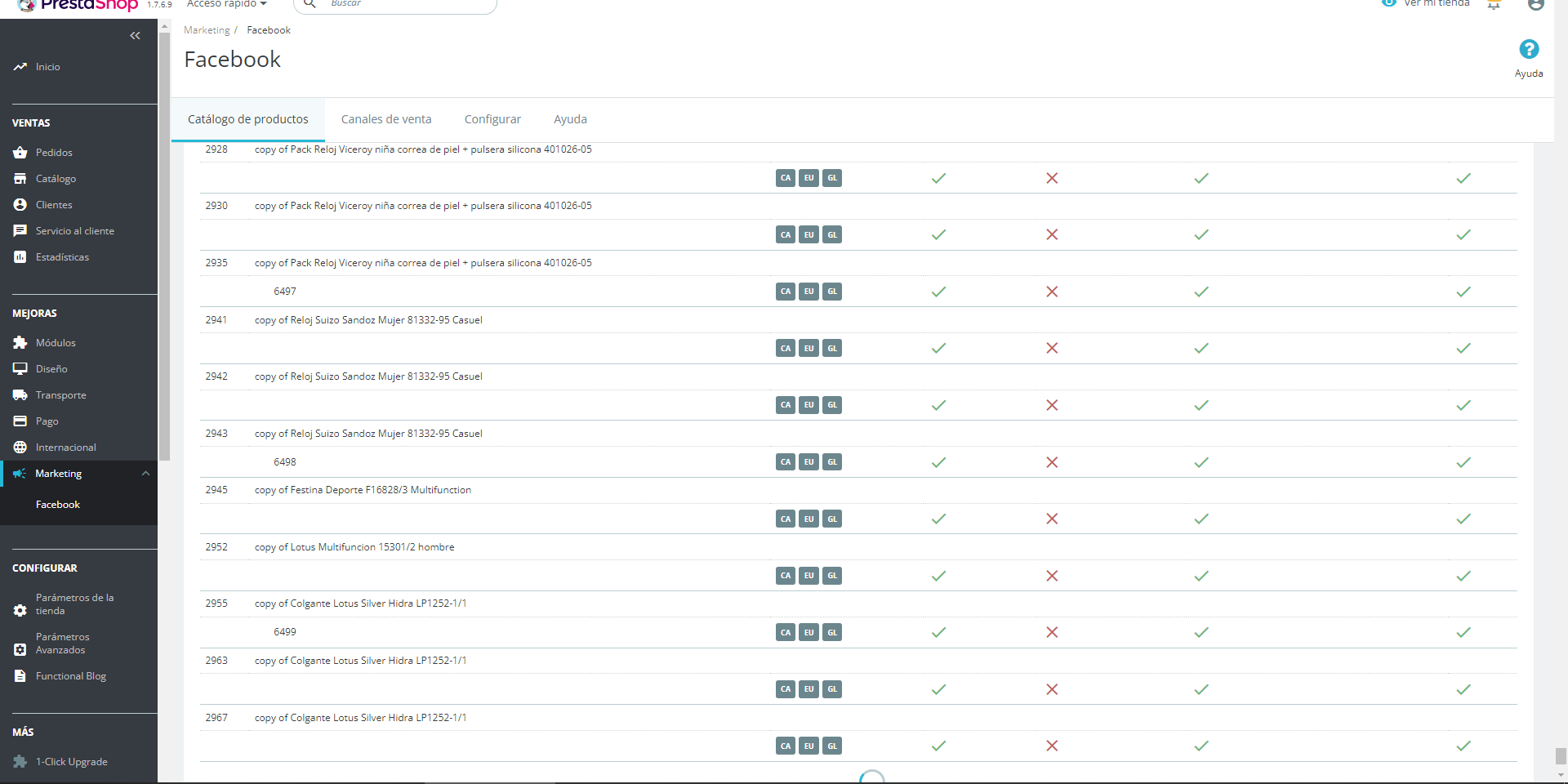 In some modules the products do not coincide with those that I currently have in the catalog. for example in the facebook module the name of the product 404 is copy of reloj... while in the catalog it is reloj...
