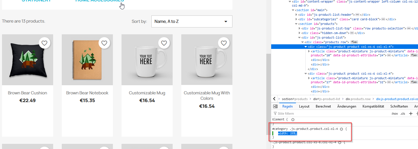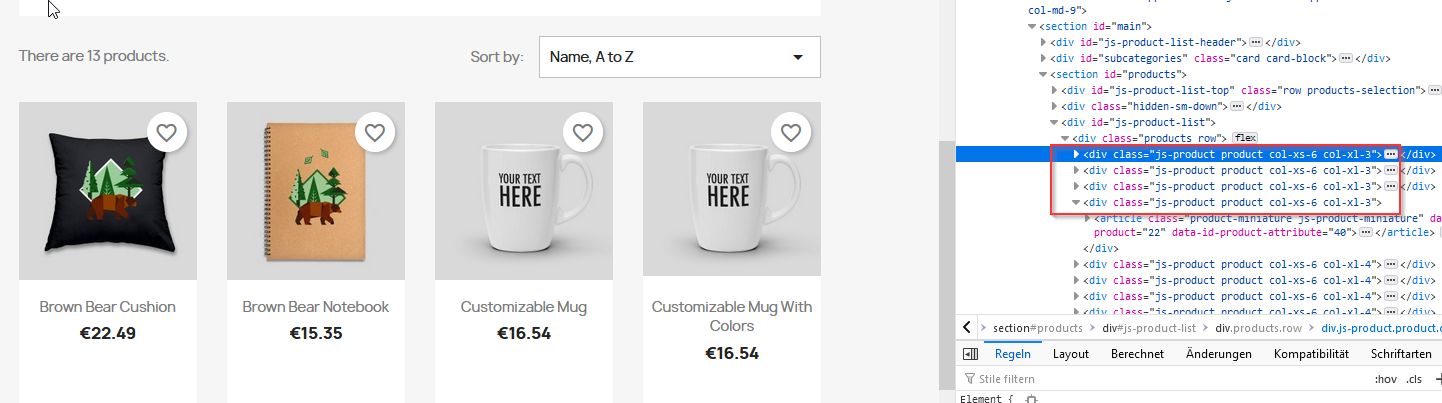 JBW Posted May 5, 2022 Share Posted May 5, 2022 Zwei Möglichkeiten: 1. Änderung im Template. z.b. im classic Theme in themes\classic\templates\catalog\listing\product-list.tpl den Wert für productClass auf col-xl-3 ändern ergibt 4 Produkte pro Zeile 2. Änderung in der custom.css für col-xl-4, Breite auf z.b. 25% setzen (media regel beachten, habe ich jetzt hier nicht gemacht) Bei beiden Varianten sind wahrscheinlich noch weitere CSS Änderungen notwendig damit es gut aussieht, z.B. die Höhe der Boxen Link to comment Share on other sites More sharing options...