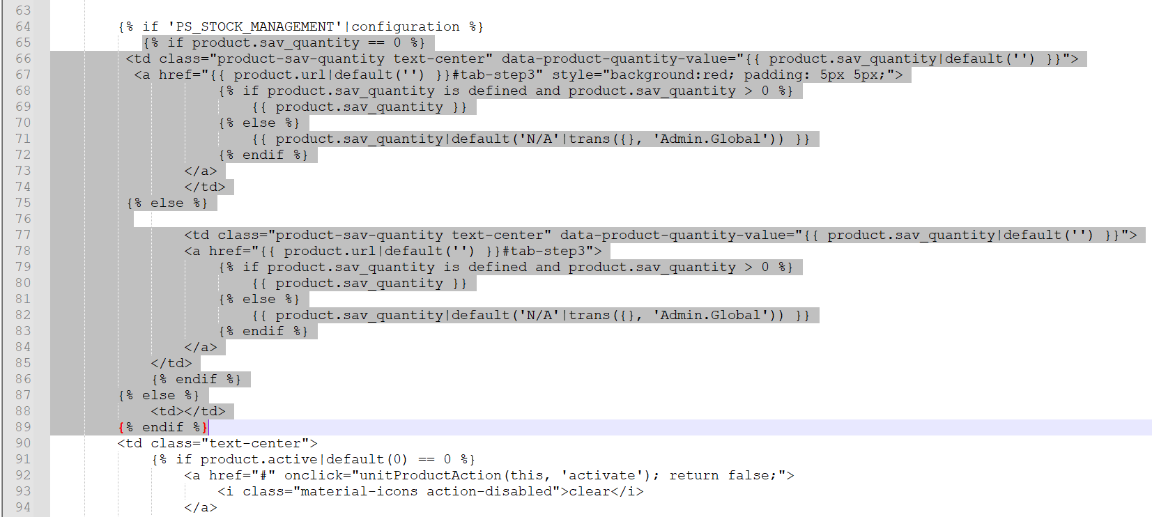 Mian Waqas Posted May 10, 2022 Share Posted May 10, 2022 (edited) Hello, Please follow this> Edit: public_html/src/PrestaShopBundle/Resources/views/Admin/Product/CatalogPage/Lists/list.html.twig file on line 64 find {% if 'PS_STOCK_MANAGEMENT'|configuration %} and add this code after/below After {% if 'PS_STOCK_MANAGEMENT'|configuration %} Replace the code to this (please look at the screenshot where it should be) {% if product.sav_quantity == 0 %} <td class="product-sav-quantity text-center" data-product-quantity-value="{{ product.sav_quantity|default('') }}"> <a href="{{ product.url|default('') }}#tab-step3" style="background:red; padding: 5px 5px;"> {% if product.sav_quantity is defined and product.sav_quantity > 0 %} {{ product.sav_quantity }} {% else %} {{ product.sav_quantity|default('N/A'|trans({}, 'Admin.Global')) }} {% endif %} </a> </td> {% else %} <td class="product-sav-quantity text-center" data-product-quantity-value="{{ product.sav_quantity|default('') }}"> <a href="{{ product.url|default('') }}#tab-step3"> {% if product.sav_quantity is defined and product.sav_quantity > 0 %} {{ product.sav_quantity }} {% else %} {{ product.sav_quantity|default('N/A'|trans({}, 'Admin.Global')) }} {% endif %} </a> </td> {% endif %} {% else %} <td></td> {% endif %} save it, clear cache and then check the results! (you can play with it along if you need deffirent areas in red) Please hit the like button if you find this helpful Regards Edited May 13, 2022 by Mian Waqas Code edit (see edit history) 1 Link to comment Share on other sites More sharing options...