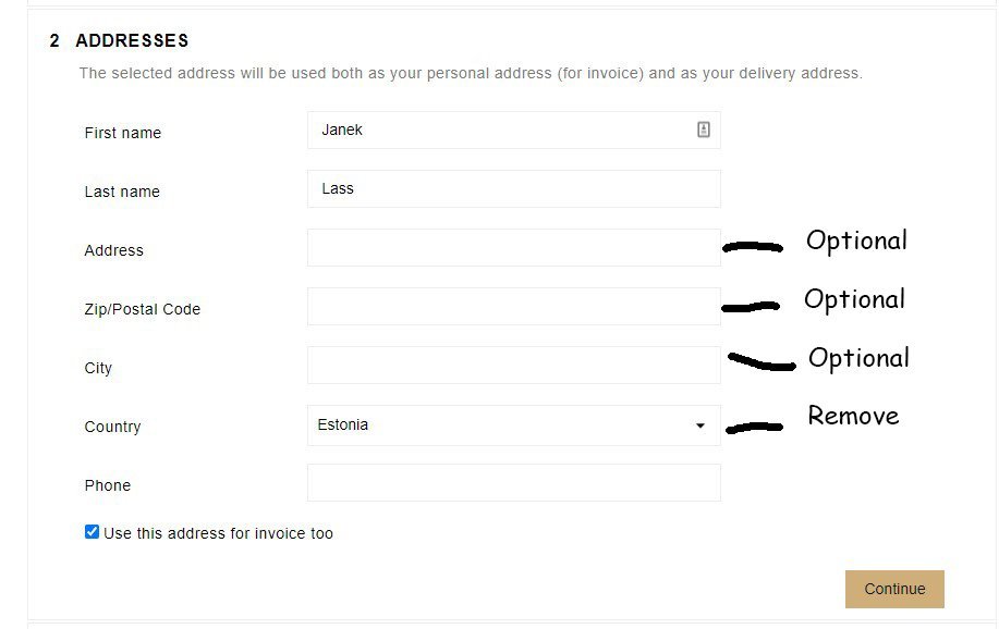 janeklass Posted May 11, 2022 Share Posted May 11, 2022 Hello, I want to make some changes to the checkout fields. It would be necessary to make the address, postcode and city optional. And would like to uncheck the country View image How to do it? Link to comment Share on other sites More sharing options...