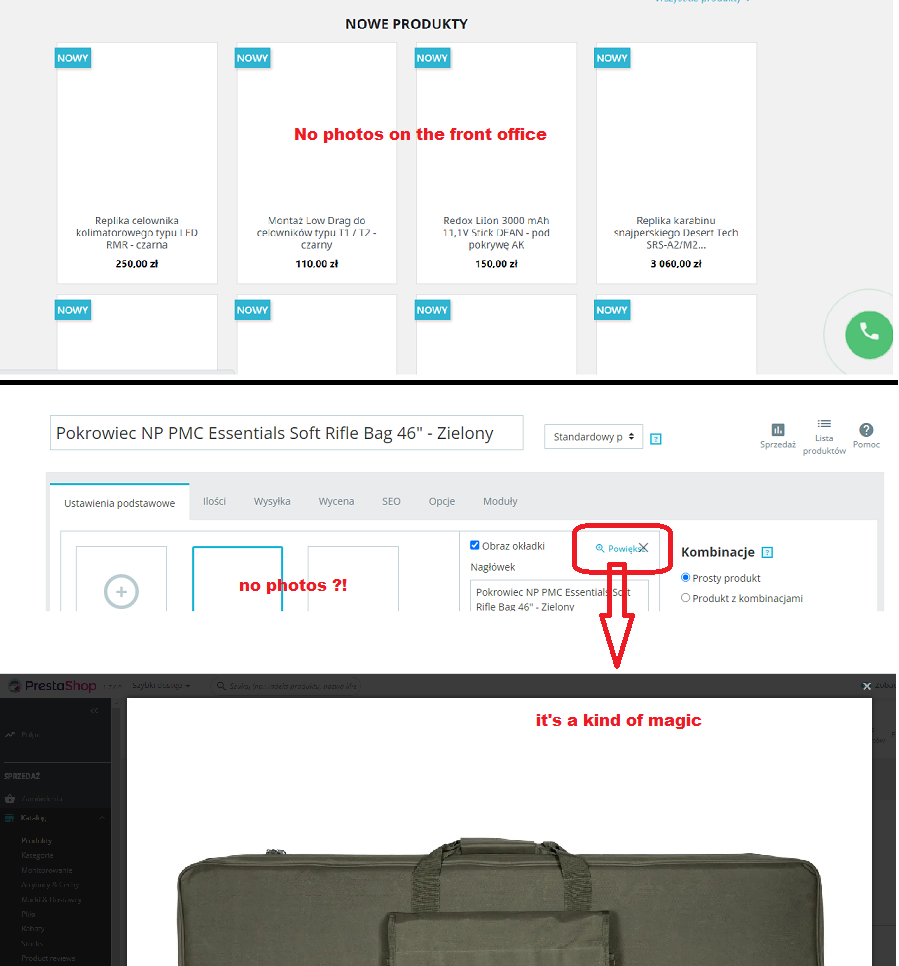 PanzerkampfPL Posted May 30, 2022 Share Posted May 30, 2022 Hi, As a consequence of the failure of module, I have a problem with the photos in some products. Instead of photos there are white boxes, both in front and back office. I accidentally discovered that if in BO when select some "empty" photo and click on zoom, the correct photo opens. I checked and indeed the files are in the FTP directory but PS "does not see" them. I wonder where the error might lie? Can re-generating the thumbnails solve the problem? I am afraid that I may aggravate the problem, so I will be grateful for the hints of more experienced colleagues Link to comment Share on other sites More sharing options...