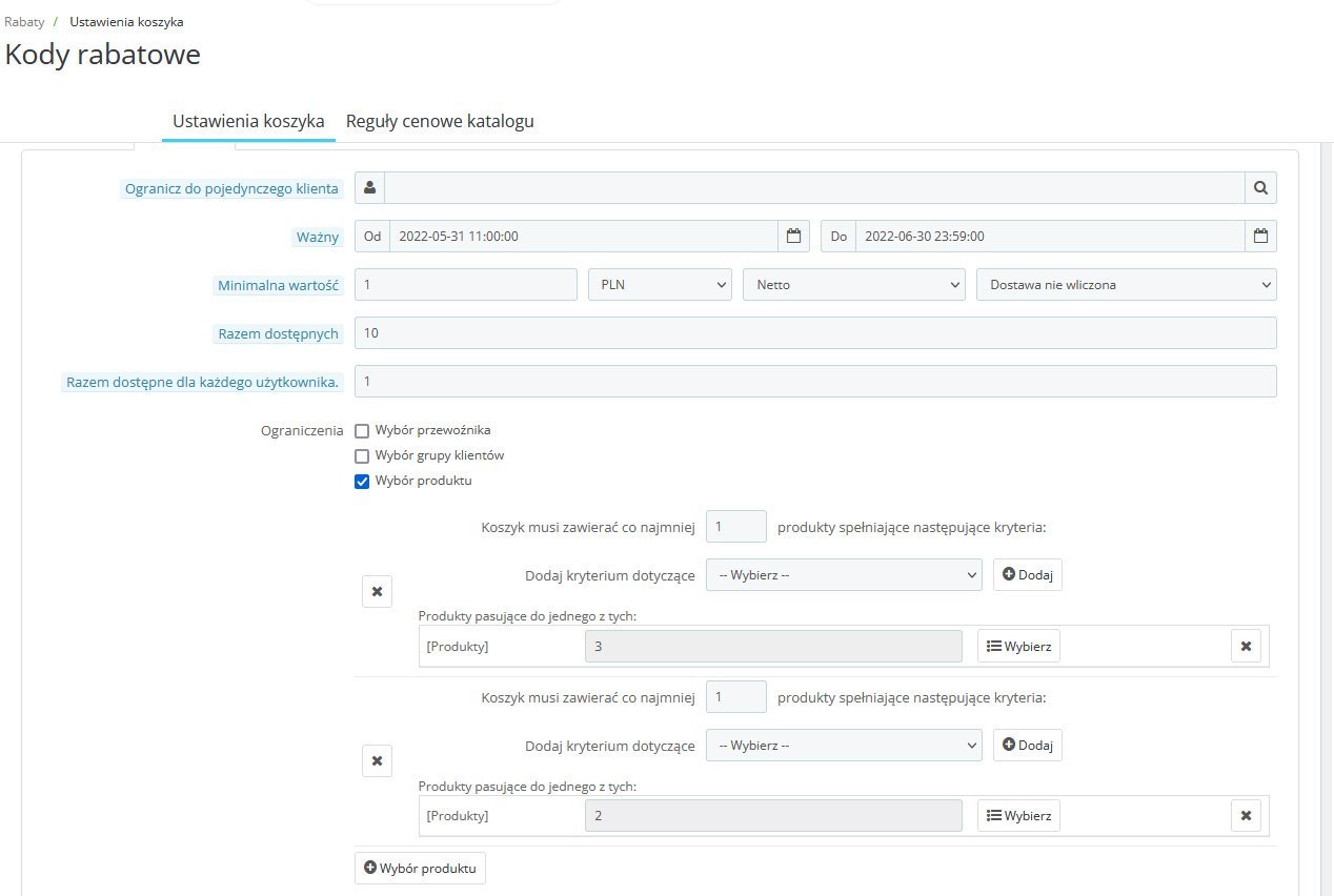 - warunek: klient wybiera pierwszy produkt z listy X + drugi produkt z listy Y