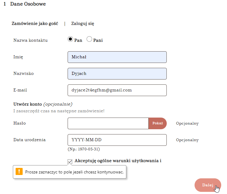 Mam dosyć nietypowy problem z checkboxem w sekcji danych osobowych podczas zakładania nowego konta lub kupowania jako gość. Po wypełnieniu danych, zaznaczeniu checkboxa "Akceptuję ogólne warunki..." oraz kliknięciu DALEJ wszystko działa poprawnie. Problem pojawia się gdy ktoś przez pomyłkę zapomni zaznaczyć checkbox i od razu kliknie DALEJ. Zgodnie z założeniem wyskakuje komunikat "prosze zaznaczyć to pole jeżeli chcesz kontynuować", ale jeśli zaznaczę checkbox i kliknę ponownie DALEJ znowu wyskakuje komunikat "prosze zaznaczyć to pole jeżeli chcesz kontynuować" (pomimo tego że checbox jest zaznaczony). Problem rozwiązuje odświeżenie strony i klikanie elementów w poprawnej kolejności (najpierw checkbox, potem przycisk DALEJ). Problem nie leży w samym module RODO, gdyż problem występuję przy różnych modułach RODO.