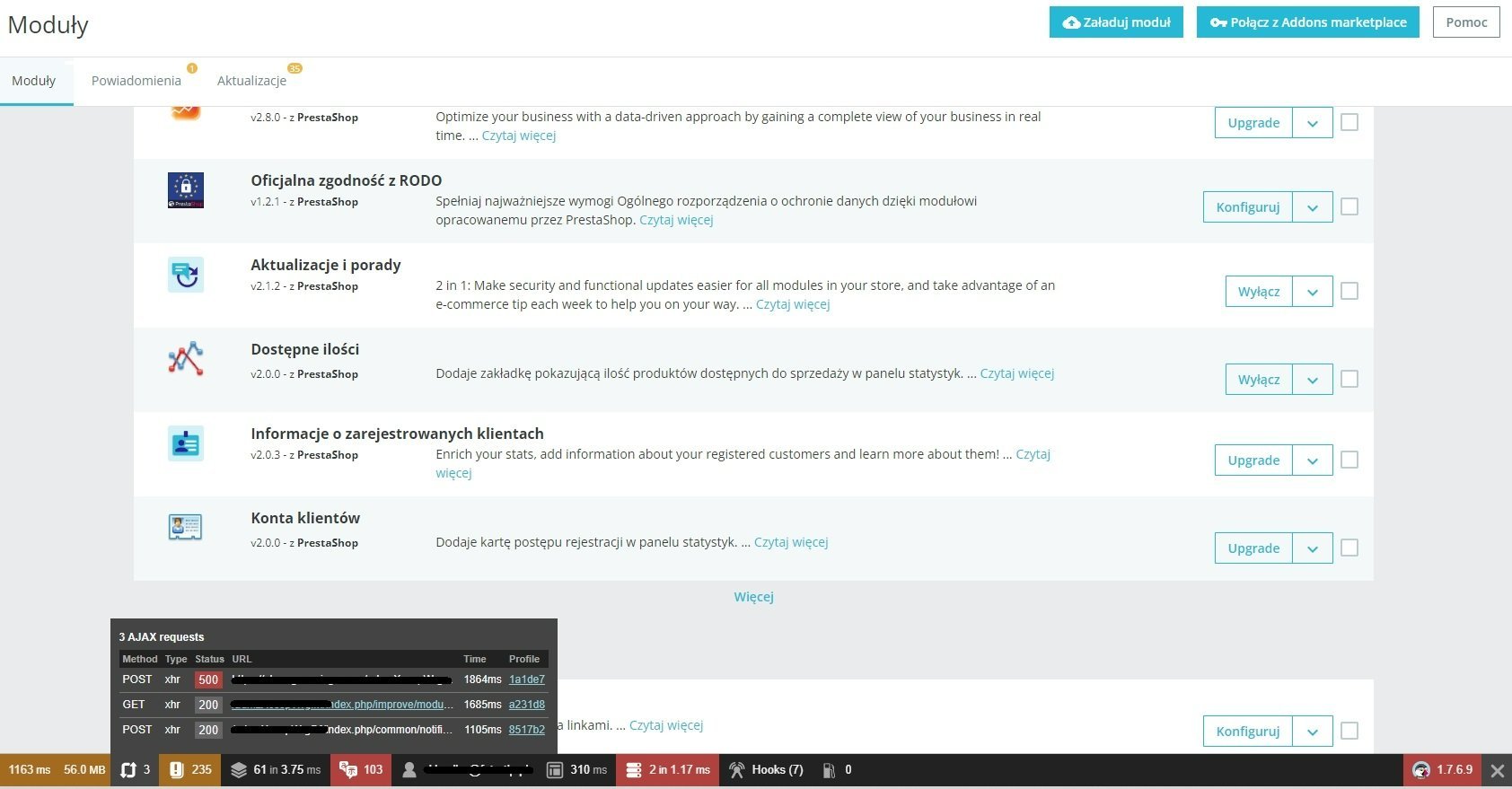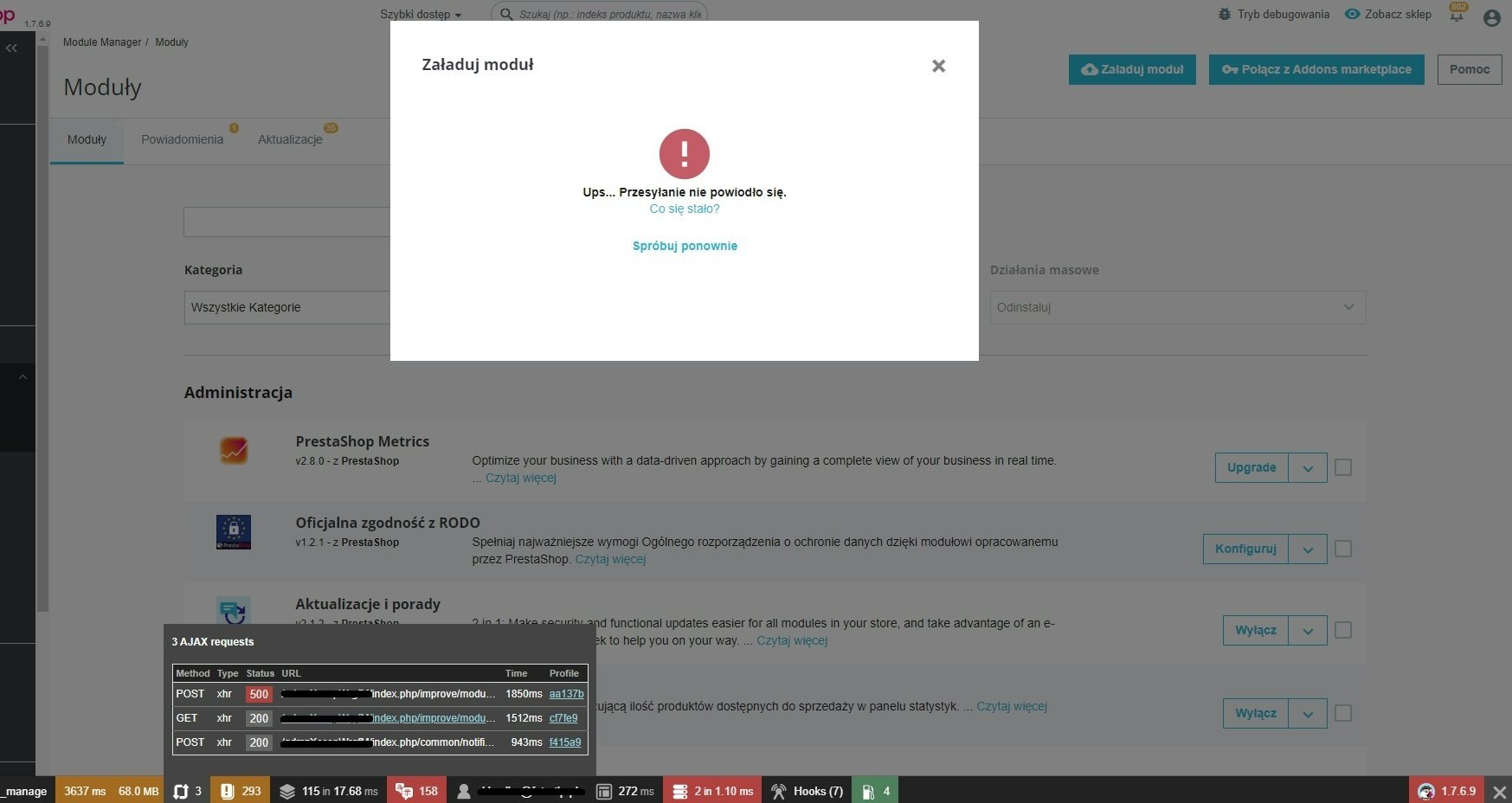Andrejkov Posted June 2, 2022 Share Posted June 2, 2022 (edited) Witam, Na jednym z moich sklepów pojawił się dziwny problem, a mianowicie nie mogę zaktualizować ani zainstalować nowych modułów ponieważ otrzymuje błąd. Podczas próby aktualizacji otrzymuje błąd(zdjęcia poniżej) Natomiast kiedy instaluję nowy moduł otrzymuje błąd "Ups... Przesyłanie nie powiodło się". Co dziwne w katalogu modules tworzony jest katalog modułu wraz z plikami, natomiast w panelu nie ma tego modułu tak jakby nie został zainstalowany. Problem jest o tyle dziwny, ze niektóre moduły normalnie się instalują, a inne już nie. (Problem z Update dotyczy wszystkich modułów) Czy ktoś jest w stanie mi pomóc z tym problemem? Edited June 2, 2022 by Andrejkov (see edit history) Link to comment Share on other sites More sharing options...
