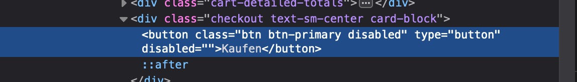 juju298 Posted June 7, 2022 Author Share Posted June 7, 2022 7 hours ago, rictools said: Ich habe leider keine Erklärung dafür warum der Button auf "disabled" steht und trotzdem funktioniert. Handelt es sich um ein Fremdtheme? Ansonsten wie geschrieben kannst du die Farbe natürlich einfach per CSS ändern, wie findest du mit der in den meisten Browsern enthaltenen "Untersuchen"-Funktion heraus, meist nach Rechtsklick erreichbar. Ist das nicht der Code, den ich rein gepostet habe? Den habe ich mit so einem Entwickler Tool mir anzeigen lassen. Aber ich verstehe den Pfad nicht, wonach muss ich suchen? Class und dann checkout text sm-center card-block finde ich nicht. Link to comment Share on other sites More sharing options...