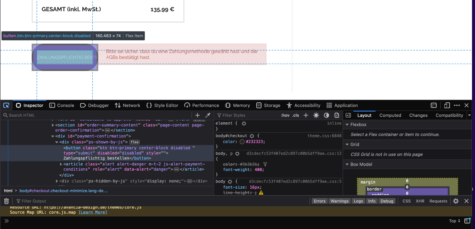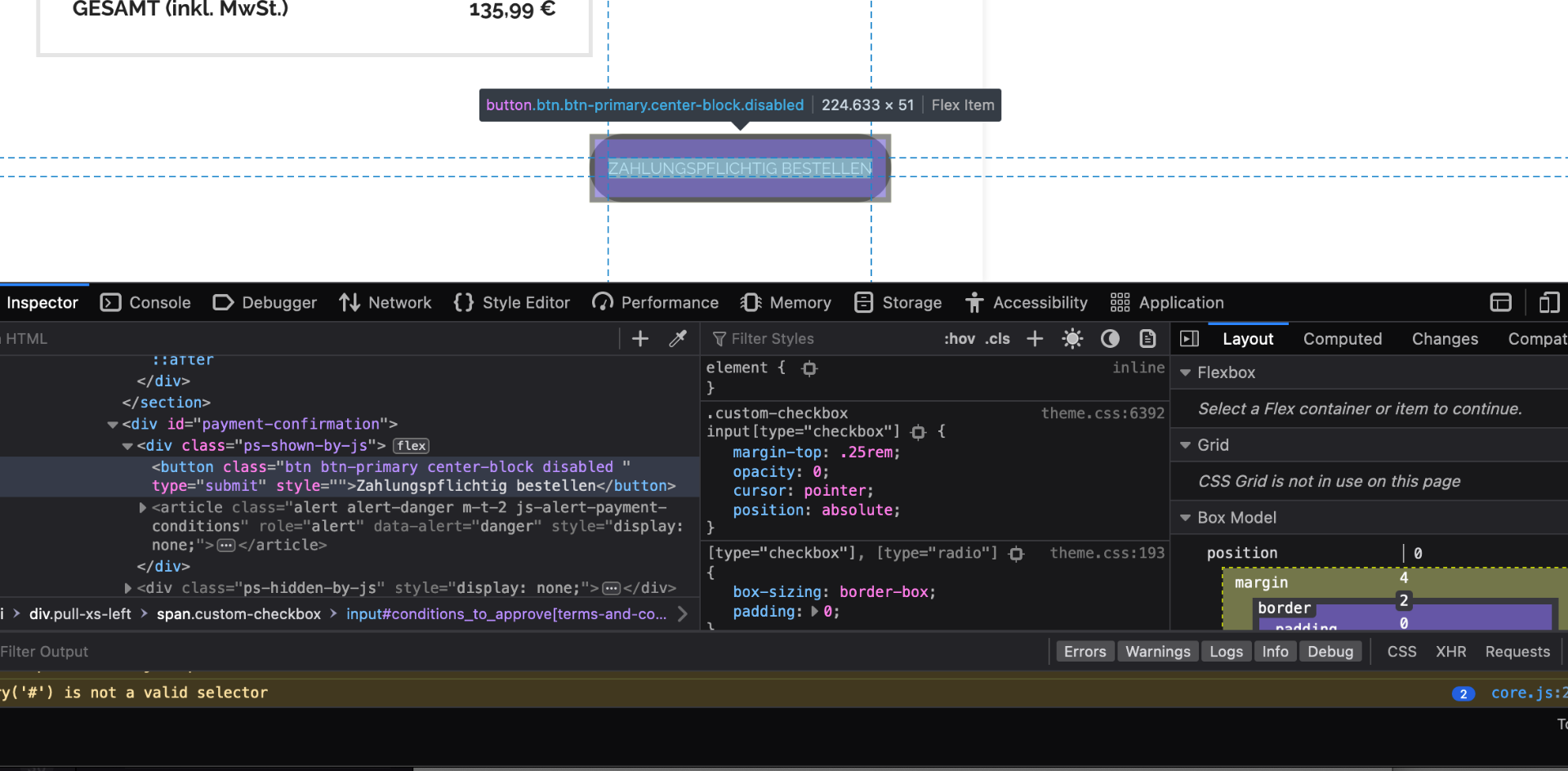 rictools Posted June 7, 2022 Share Posted June 7, 2022 Der Text "Bitte sei sicher ..." scheint da nicht hinzugehören, es hat schon einen Grund warum der Button als "disabled" gekennzeichnet ist, wenn nicht an den Zahlungsmethoden hängt es vielleicht an der AGB-Bestätigung, ist da etwas gebastelt worden? Vermutlich ist CSS-Caching aktiv, dann wird die CSS-Datei nicht angezeigt, muß man ggf. temporär deaktivieren. Dann werden bei dir (eigentlich ungewöhnlich) die CSS-Stile offenbar alphabetisch sortiert, der Eintrag für "button" müßte etwas weiter unten kommen. Die am besten in die custom.css einzutragende Anweisung müßte dann mit "div.payment-confirmation button { ..." beginnen. Link to comment Share on other sites More sharing options...