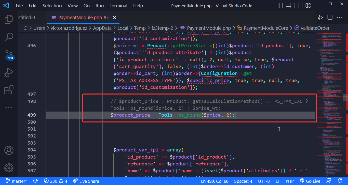 Victoria Cancinos Posted June 10, 2022 Author Share Posted June 10, 2022 Ya lo solucioné, la linea 498 se comenta y se pone: $product_price = Tools::ps_round($price, 2); De esa manera traerá el precio de los productos sin impuestos Saludos. 2 1 Link to comment Share on other sites More sharing options...