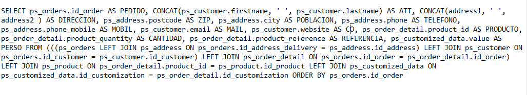 Tom Girou Posted June 17, 2022 Share Posted June 17, 2022 SELECT ps_orders.id_order AS PEDIDO, CONCAT (ps_customer.firstname, ' ', ps_customer.lastname) AS ATT, CONCAT(address1, ' ', address2) AS DIRECCION, ps_address.postcode AS ZIP, ps_address.city AS POBLACION, ps_address.phone AS TELEFONO, ps_address.phone_mobile AS MOBIL, ps_customer.email AS MAIL, ps_customer.website AS CO, ps_order_detail.product_id AS PRODUCTO, ps_order_detail.product_quantity AS CANTIDAD, ps_order_detail.product_reference AS REFERENCIA, ps_customized_data.value AS PERSO FROM ps_orders LEFT JOIN ps_address ON ps_orders.id_address_delivery = ps_address.id_address LEFT JOIN ps_customer ON ps_orders.id_customer = ps_customer.id_customer LEFT JOIN ps_order_detail ON ps_orders.id_order = ps_order_detail.id_order LEFT JOIN ps_product ON ps_order_detail.product_id = ps_product.id_product LEFT JOIN ps_customized_data ON ps_customized_data.id_customization = ps_order_detail.id_customization ORDER BY ps_orders.id_order Ahí está la consulta bien escrita. Para mí, no veo problemas. Pregunta tonta, has consultado tu base de datos para verificar que haya datos en ps_customization ? Link to comment Share on other sites More sharing options...
