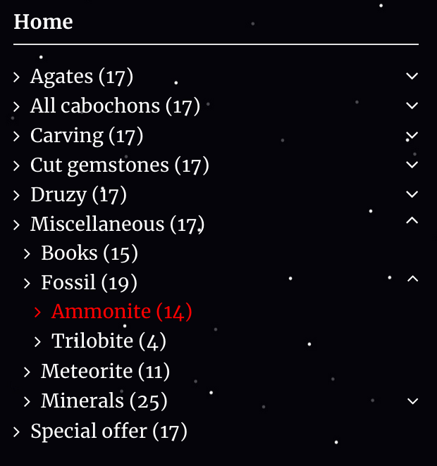 Dema7 Posted July 20, 2022 Author Share Posted July 20, 2022 1 hour ago, stifler97 said: Hi @Dema7 I just upgraded the ps_categorytree module. Check this out. Hi stifler97, thank you a lot, I installed the module and overrided the ps_categorytree.tpl in my theme without issues! I also applied this edit to made the categories to expand and highlight the current one https://www.sunnytoo.com/8222/how-to-set-the-category-tree-links-module-to-expand-the-brunch-containing-current-category-in-prestashop-1-7 You can see it working in the attached screenshot!! Can I ask you another thing? Do you think it is possible to have the root categories to show the sum of all products in subcategories? Or do I need to manual assign the product to all the categories, for example "Miscellaneous" + "Fossil" + "Ammonite"? Thank you again!!! Link to comment Share on other sites More sharing options...