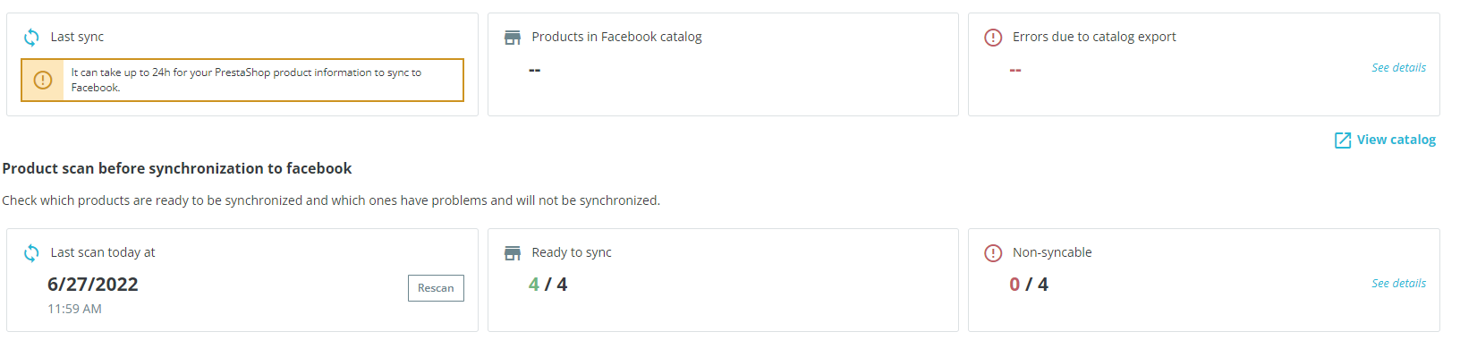 NeroTCh Posted June 28, 2022 Share Posted June 28, 2022 Hello, I have created a test Prestashop for testing and for my future projects and I need to sync Prestashop with Facebook marketplace. I have installed the PS_facebook module and connected with Facebook It say's that sync can take up to 24 hours, but even after weeks it doesn't sync: I tried with 100-500 products in catalog and even with 1, but it still doesn't sync Maybe I need to do something on Facebook or Prestashop backoffice? I also upgraded prestashop account module, but it didn't help Prestashop version: 1.7.6.9 php version: 7.2.34 Link to comment Share on other sites More sharing options...