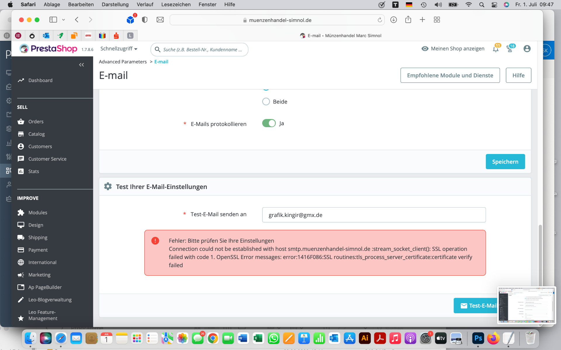 Selma Posted July 2, 2022 Share Posted July 2, 2022 Ich habe den Webshop in plesk integriert und habe folgende Fehlermeldung mit meiner Email: Fehler: Bitte prüfen Sie Ihre Einstellungen Connection could not be established with host smtp.muenzenhandel-simnol.de :stream_socket_client(): SSL operation failed with code 1. OpenSSL Error messages: error:1416F086:SSL routines:tls_process_server_certificate:certificate verify failed Wenn ich ein Email Account von [email protected] benutze funktioniert der Email Austausch in prestashop reibungslos bis auf den Austausch mit gmx Accounts. Da kommt keine Email Antwort hin. Ich habe die gmail Email in prestashop ausgetauscht in eine [email protected] von Strato mit ssl Verschlüsselung eingesetzt. Da bekomme ich folgende Fehlermeldung erhalten: Fehler: Bitte prüfen Sie Ihre Einstellungen Connection could not be established with host smtp.muenzenhandel-simnol.de :stream_socket_client(): SSL operation failed with code 1. OpenSSL Error messages: error:1416F086:SSL routines:tls_process_server_certificate:certificate verify failed Hierbei gehen die Emails nicht raus. Ich habe sogar die ssl Verschlüsselung in plesk noch einmal ausgetauscht. Ich habe es sogar mit einer gmx Email probiert. Da kommt die Email wiederum nicht in gmx an. Was mache ich falsch? Grüße Selma Link to comment Share on other sites More sharing options...