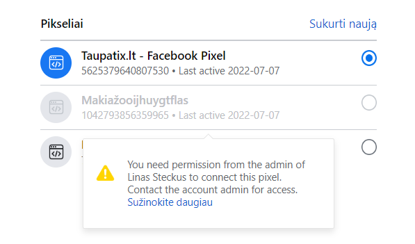 rimstaske Posted July 7, 2022 Author Share Posted July 7, 2022 Skip another message, please see this.. How to give permission from my profile ,that I would can to choose this pixel? What i try to do: I'm in prestashop and with Facebook module want to connect new pixel. Link to comment Share on other sites More sharing options...