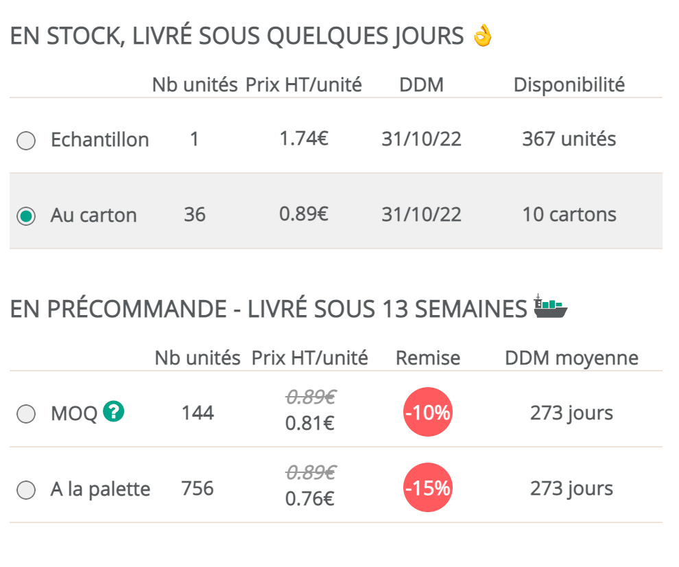 lakeup Posted July 15, 2022 Author Share Posted July 15, 2022 Merci, je t'avoue que je n'ai pas encore tout les details, mais dans l'idéal on a sur la page produit le choix entre different conditionnement (cartons, demi palettes et palettes) Link to comment Share on other sites More sharing options...