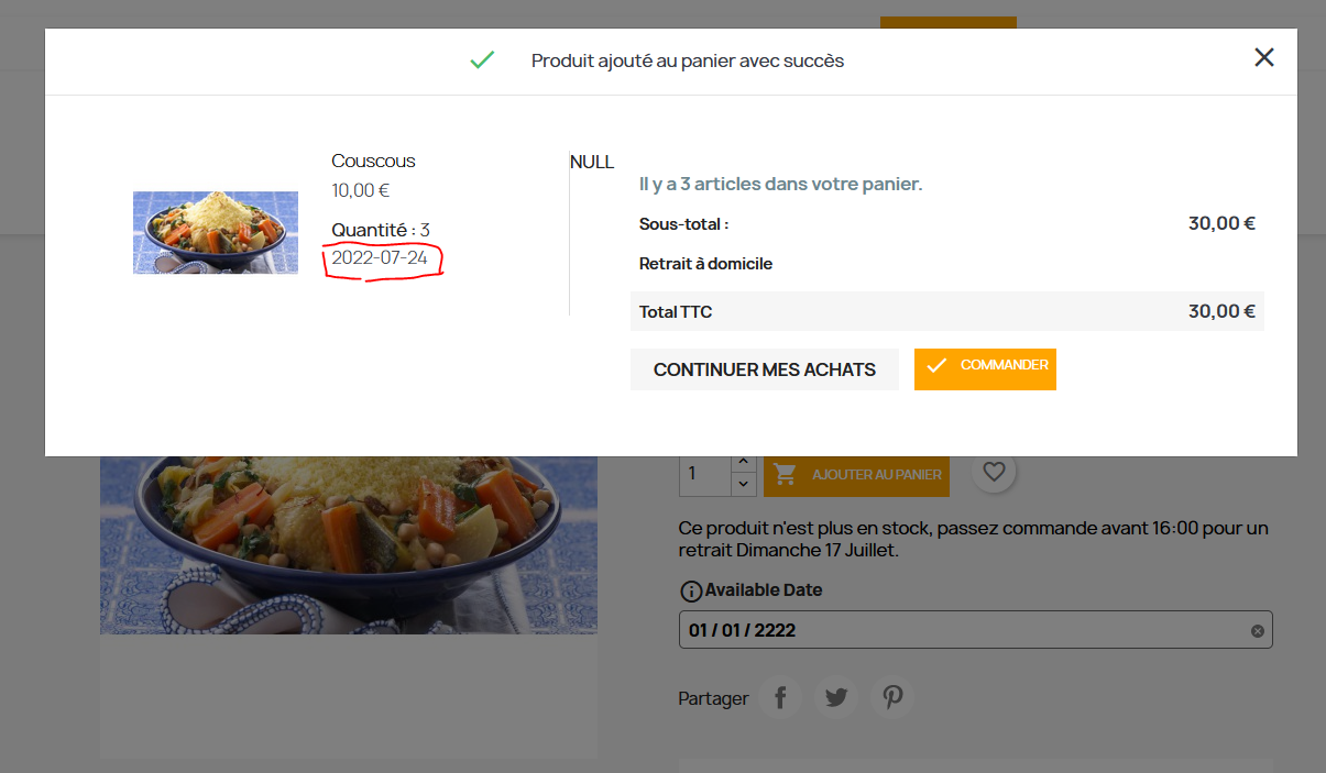 Eliott_Crmx Posted July 15, 2022 Share Posted July 15, 2022 (edited) Hello, I need your help to understand how to retrieve the data from the product page form (product.tpl) sent by the 'add to cart' button (product-add-to-cart.tpl include). Indeed, I would like to retrieve the value of a datepicker field, added under the entry dedicated to the quantity of the product page, in order to save it in the ps_cart_product table. Despite my research in the cart class and its controller, I can't do it. How to retrieve the value of an entry in the home page of a product? A null date (0000-00-00) is however well recorded in our new columns date_retrait in ps_cart_product, we manage to recover it as you can see on a screen, but not to record it correctly. Where can I call $_POST or REQUEST from the input datepicker name = date_retrait (here it is 2022-07-24 but this is only a test, modified directly in the DB, normally it displays 0000-00-00) Edited July 15, 2022 by Eliott_Crmx (see edit history) Link to comment Share on other sites More sharing options...