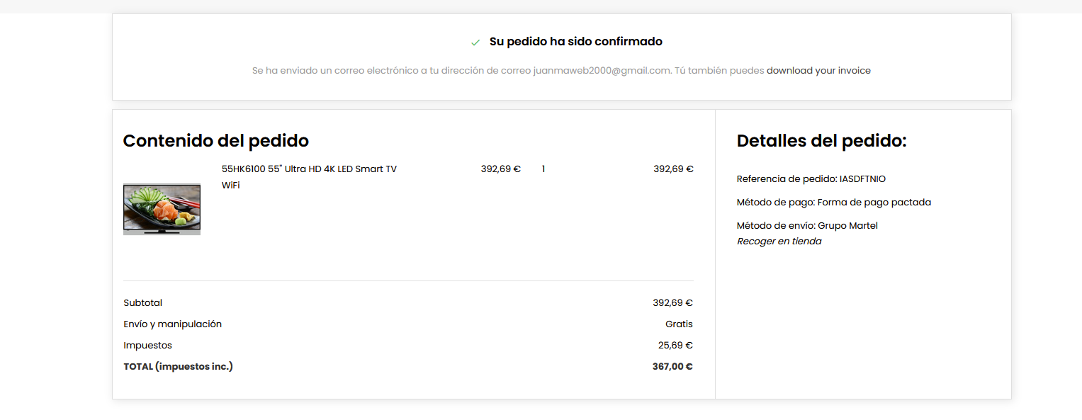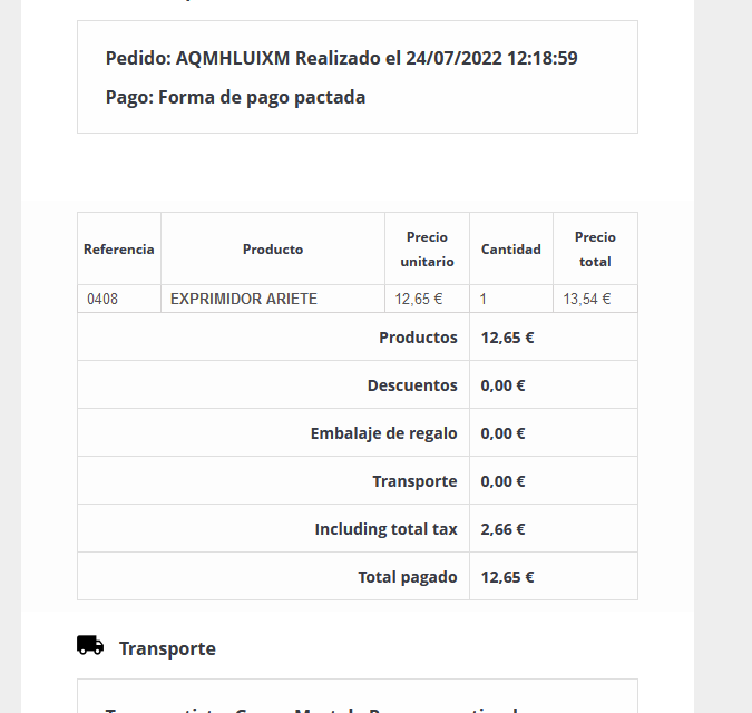 juanmaweb Posted July 24, 2022 Share Posted July 24, 2022 Hola a tod@s, tengo un problema a ver si pueden ayudarme. Tengo Prestashop 1.7.6.5 y el problema es que tanto en el carrito como en el correo que envía no me suma los impuestos. Alguien sabe a que se debe y como solucionarlo? Muchas gracias Link to comment Share on other sites More sharing options...
