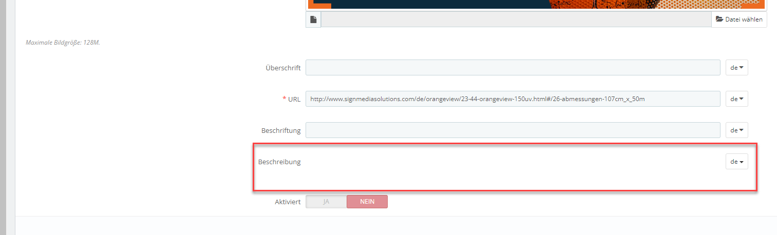 SMSgmbh Posted July 29, 2022 Share Posted July 29, 2022 Hallo, nachdem ich heute aufgrund von PHP-Script auf Version 1.7.8 upgedatet habe, kann ich im Modul "Bilder Slider" leider keine Beschreibung mehr eingeben...die bisherigen Beschreibungen werden aber im Frontend angezeigt...allerdings kann ich nun keine neuen Slider mehr mit Beschreibungen versehen, bzw. bestehende Beschreibungen nicht mehr anpassen... Jemand ne Idee? hler Link to comment Share on other sites More sharing options...