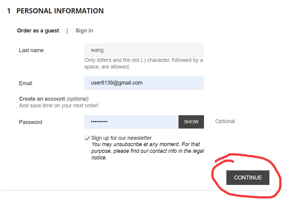PrestaShop added items to shopping cart, unable to CONTINUE the order with the visitor account. After I filled in all the registration information in the visitor registration screen, clicking the CONTINUE button is not valid I have enabled the customer checkout in the order Settings in the background