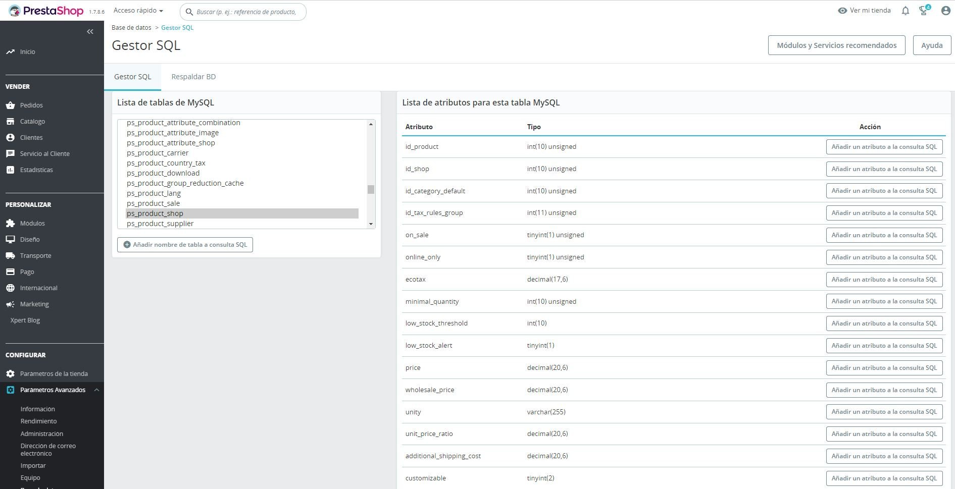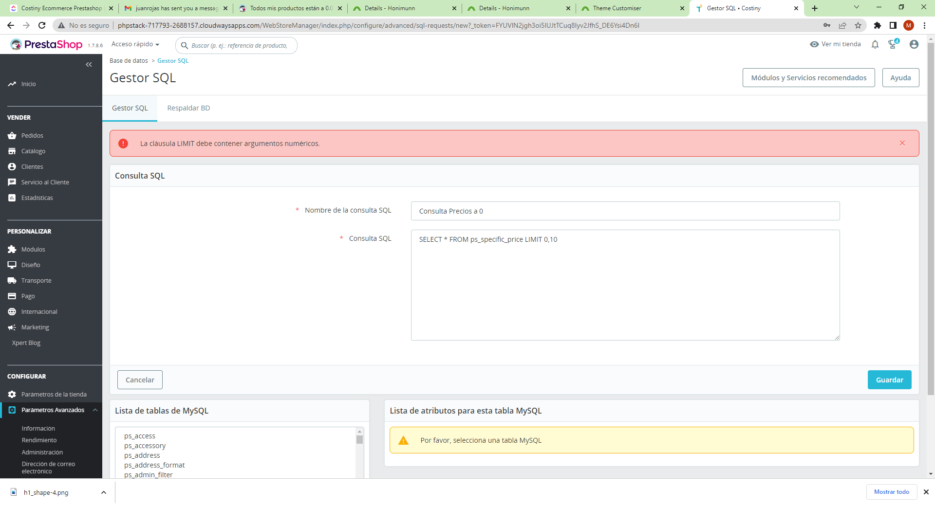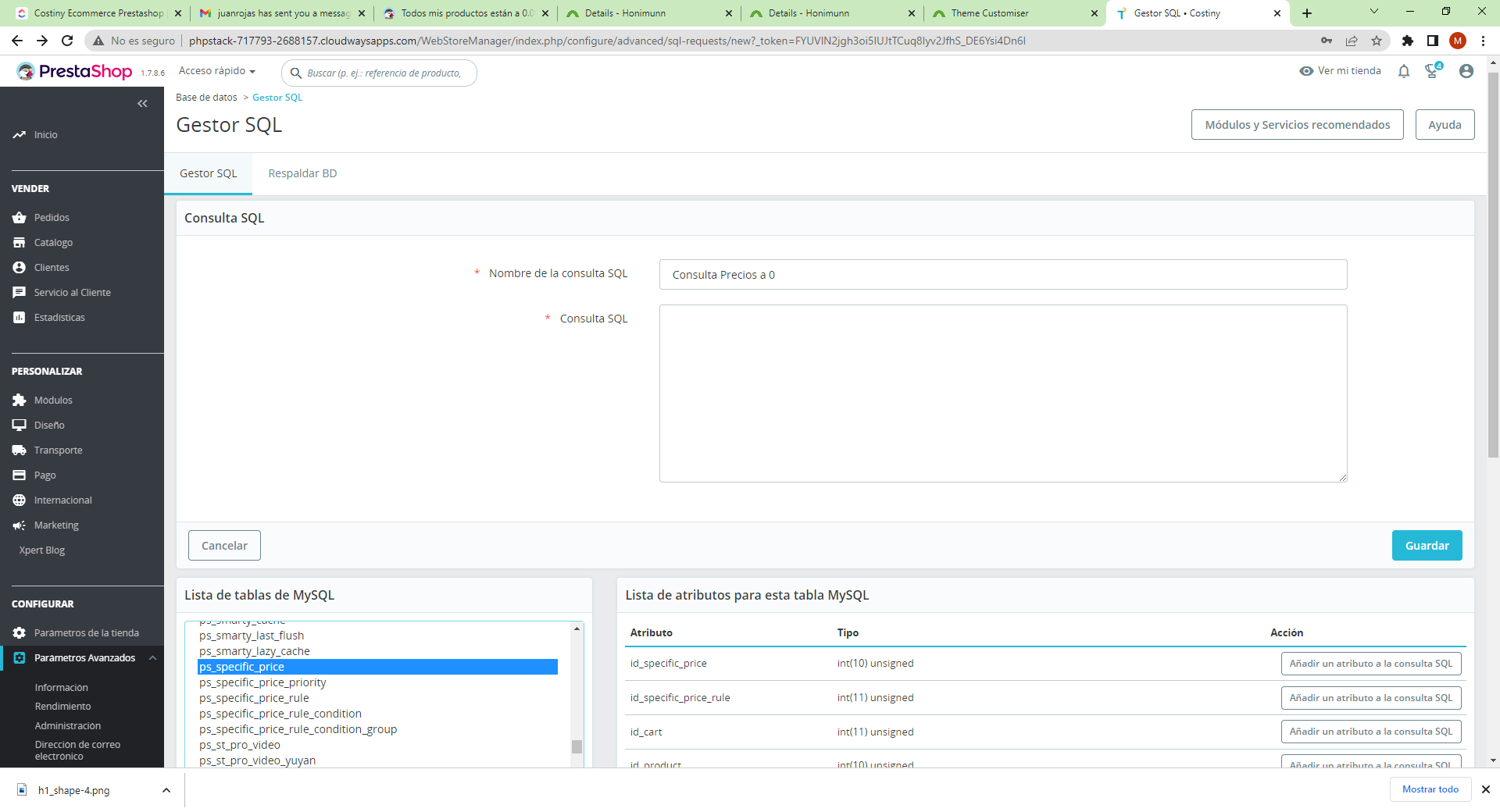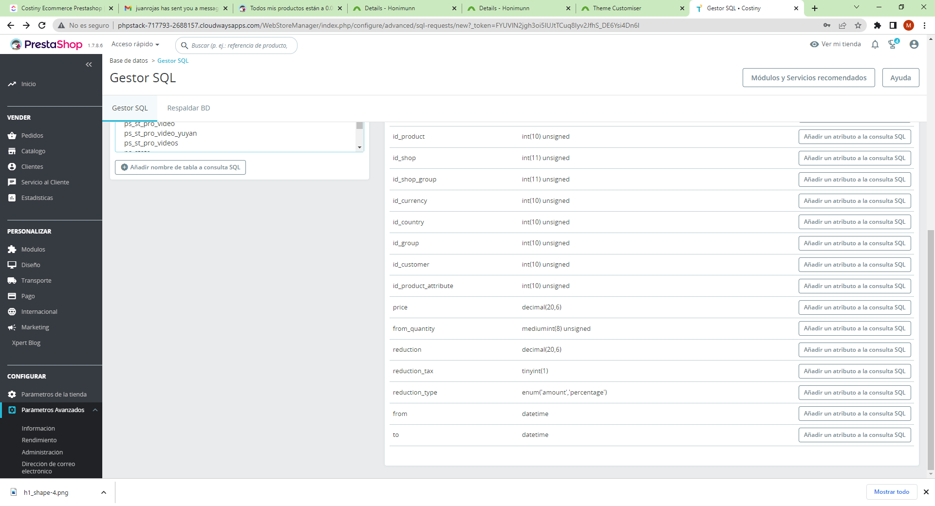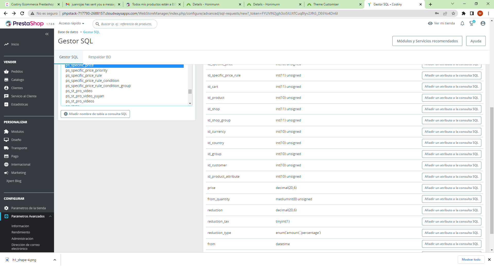 monicaamb Posted August 9, 2022 Author Share Posted August 9, 2022 7 minutes ago, [email protected] said: Buenas, como ya te indicaron, pon la web en mantenimiento (ahora mismo está online) y pon tu ip para poder hacer las pruebas. Por otro lado en la primera imagen que posteaste, en la pestaña precio que tienes puesto? Abajo en esa pestaña te aparece Precio Específico, te sale algo? Por otro lado, entra en la base de datos y haz la siguiente consulta (supongo que las tablas comienzan por "ps_" si no es así cambia el prefijo en la consulta) SELECT * FROM ps_specific_price LIMIT 0,10 y si sale algún resultado yo empezaría por esta tabla. Si no sabes como entrar en la base de datos desde prestashop: Parametros avanzados -> Base de datos: Añadir Nueva Consulta SQL -> Dale el nombre que quieras y en Consulta SQL pega la consulta que te puse. -> Guardar Ahora dale al icono de la nuve con la flecha para abajo y te descargará el resultado de la consulta. Si el CSV tiene datos podría ser el problema de los 0.00€ Un saludo. Hola, gracias. Me piden que la web esté online de momento ya que están revisando contenido. En cuanto me avisen la pongo en mantenimiento. Link to comment Share on other sites More sharing options...